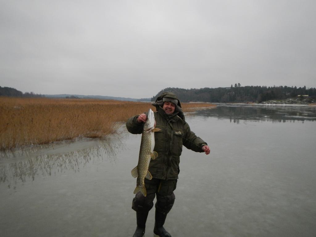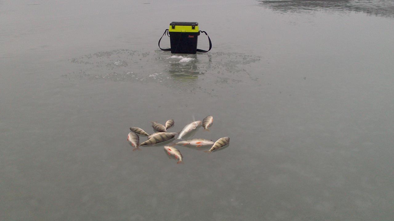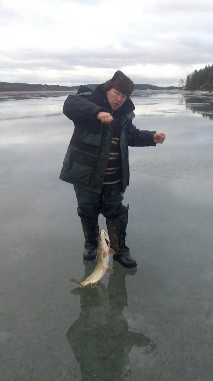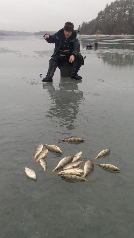 Выйдя на гладкий лед, покрытый слоем водички, мы ощутили реальную силу ветерка и пошли ловить в противоположном направлении, около острово Hjortoholmen, чтобы попробовать укрыться от ветра за скалой на противоположном берегу. Кажется, у нас это неплохо вышло и прикрыв лунку ящиком и ногами, удавалось делать неплоху проводку. Но, видимо, погодка клеву не способствовала и утренние часы прошли за бесклевьем. Ближе к обеду окунь таки проснулся, но откликался только на мотыля, которого у нас было более чем достаточно.
