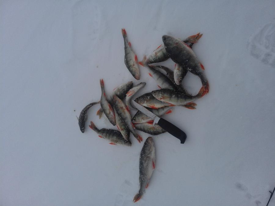 Немного оптимизму перед выходными. Сегодня отвезли меня на 3 км Калласте.По снегу комфортно идти только по следам от техники.Рыб клевал с утра и до 3 дня.Очень радовал размер окуня.Мелких попалось штук 20 только.Соседи отловились похуже(сидели на одних лунках.)