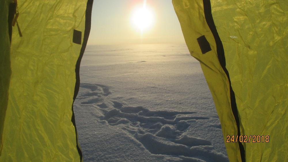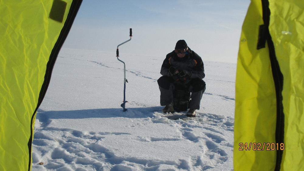 Потом просто , всё встало на свои места , рыбы сегодня не будет , ОН нарисовался во всей красе. При морозе бегать сильно не хотелось , план был палатка и на точку где гарантированно что то было . Эх в палатке хорошо , солнышко заглядывает , хоть загарай. В палатке настроил пару лунок , одну удочку типа донки , второй думаю буду играть секухой приманивая крупняк, но не случилось , нечего при выезде по сторонам смотреть, выискивая болты .