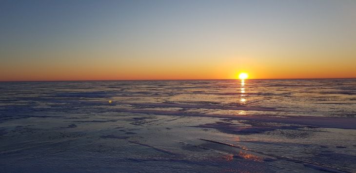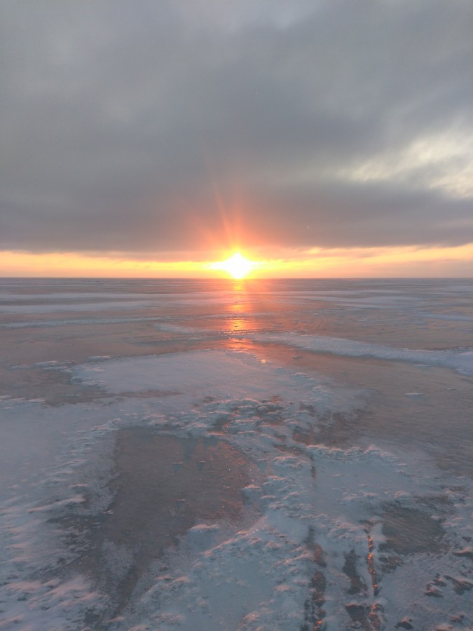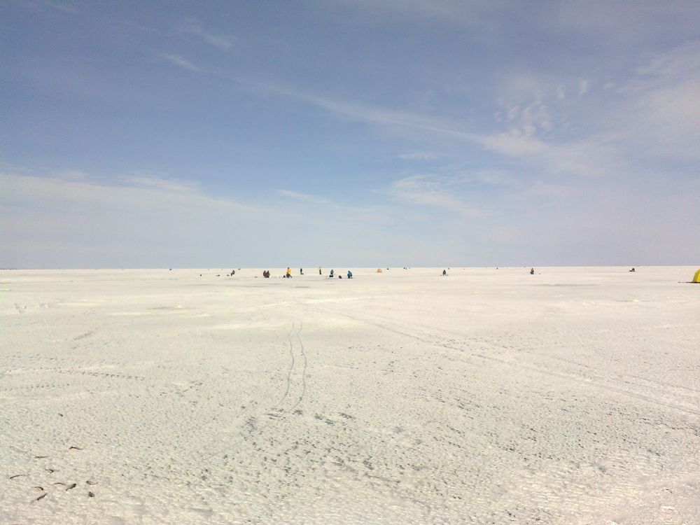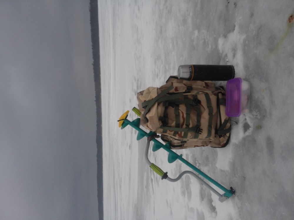 Тормознули в Лахтовке. На улице рисует -10. Но ветерок не большой и вроде даже нет дискомфорта. Курс-прямо на солнце Благополучно пересекли несколько трещин, и тормознулись на точке, на какой то. Начало более чем удачное, у Сани сразу несколько плотвин. Решили ни куда не дёргаться, а пробовать раскачать лунки. лунки раскачались где то к 13.00. Да и то, какой то всплеск активности конечно был, нопришвартоватся не где.