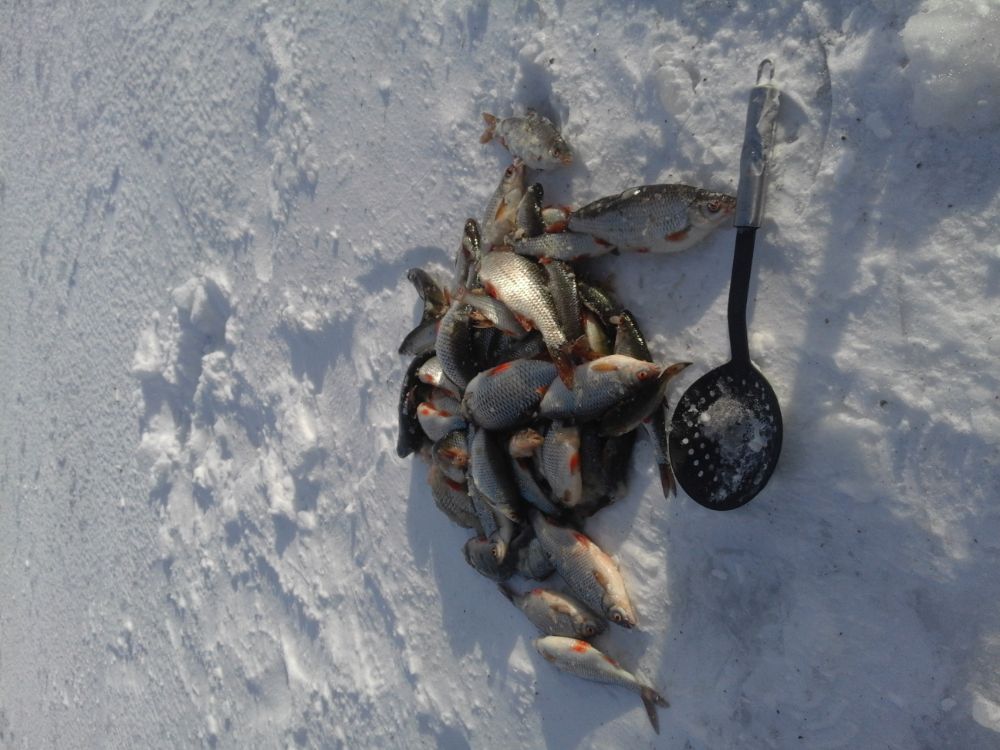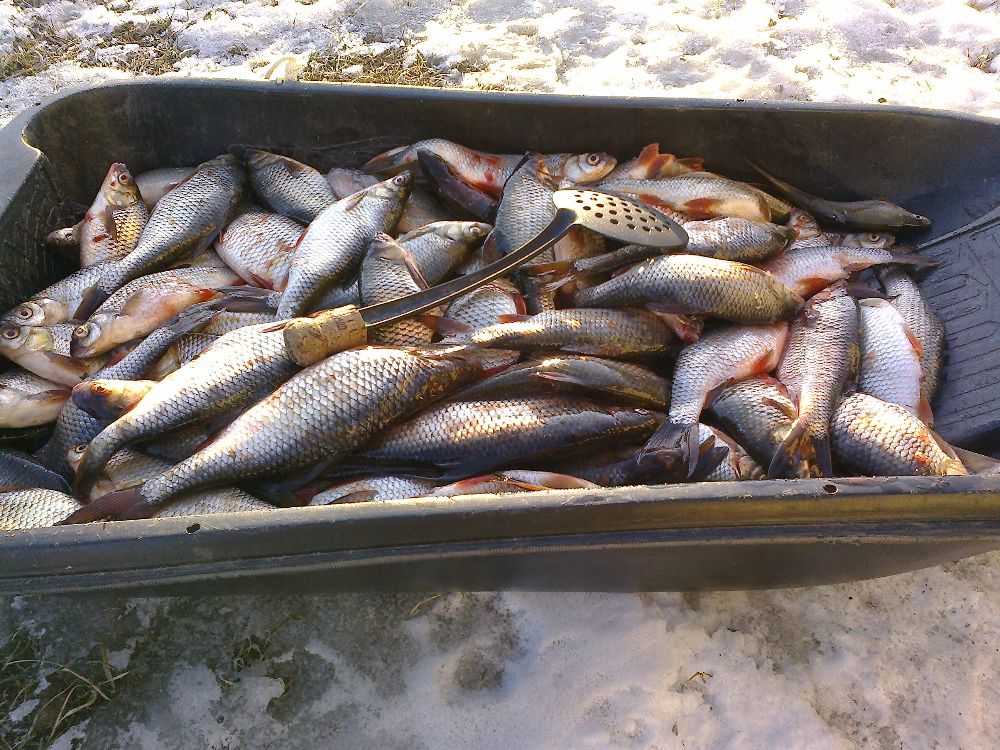 Всем доброго времени. Прокатился сегодня до озера и отдохнул, и рыбки половил. Ловил с 8.00 до 13.30, в два часа подался до берега. В улове, плотвы 16 кг, два пончика окунёвых и подлещик. Если б остался на часика три четыре, можно было ещё надёргать. С утра под берегом было всё чисто, только трещины, обратно выходил, уже наломало. Всем всего.