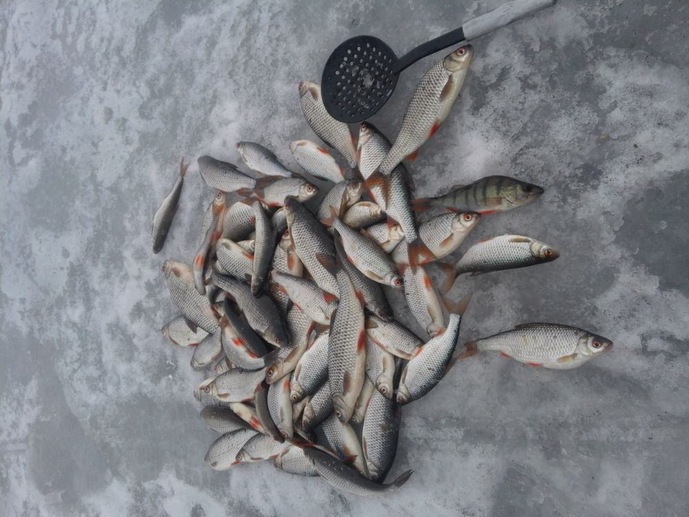 Выбрались на самый северо-восток озера по наводке, что в этом районе на неделе ловили хороших окуней. Погода манго, днём было дело, бушлат снимал, так пригревало. Как разогрело воздух, лёд трещал без передышки, трещину в берегу чуток сдвинуло. По рыбе, с утра на железо поднял шесть размерных полосатиков, потом пробовал регулярно на мотыля, но как-то не заладилось, несколько хороших плотвин, микроокуньки все обратно в лунку, ерши упитанные...