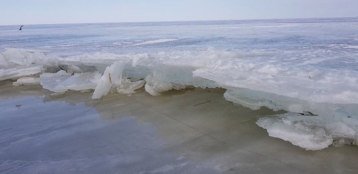 Трещало поменьше чем в пятницу, но лёд ещё немного сдвинуло, в береговой трещине лёд маленько сторосило.