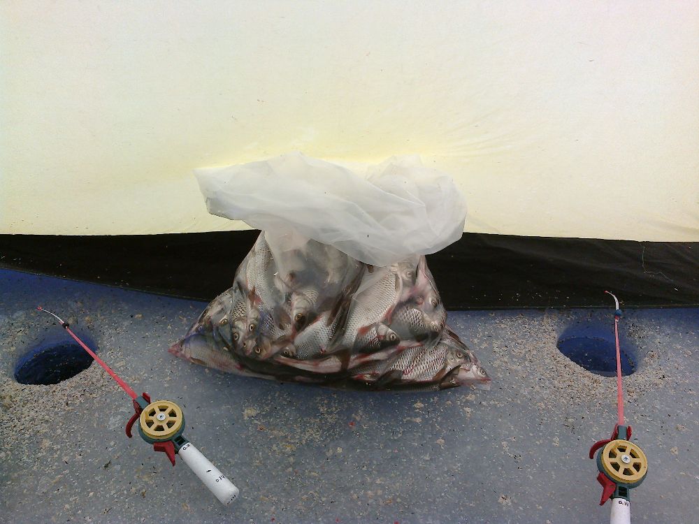 Закормились. Я палатку организовал. Рыб раскачивался очень туго. Видимо утренний мороз ( -8*) даванул малехо.