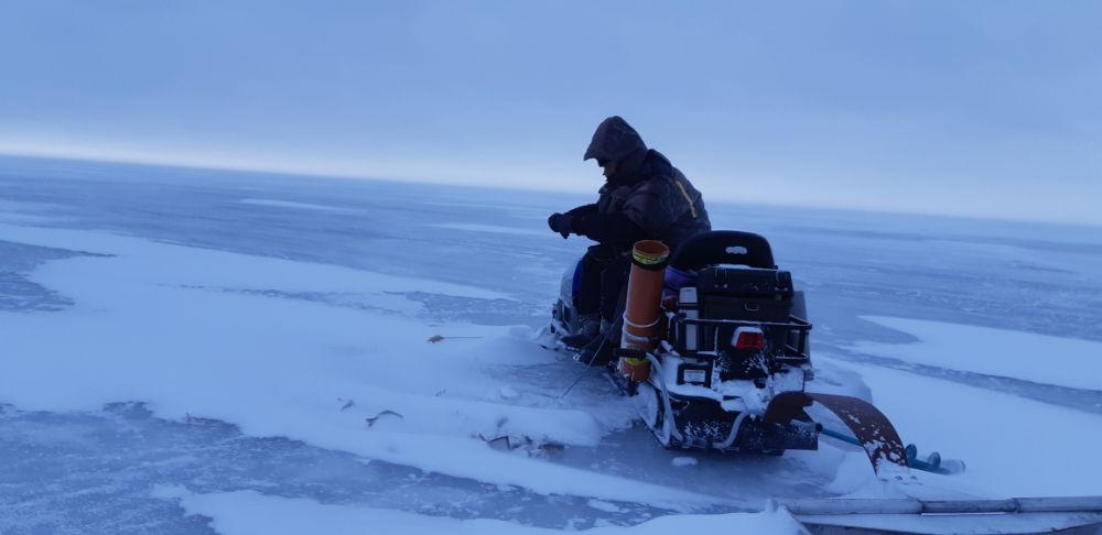 Ладно нашёл их , сидят спиной к дороге и куй повернутся , на звук снегохода , ОНИ ловят рыбу , а ты тут катаешься, где то прикинул в 200 метрах от них проехал , куй пристали даже со стульчаков ,шапки нахлобучены по самые уши и увлечены ловлей. Вот так и хотелось показать им направление , куда идти