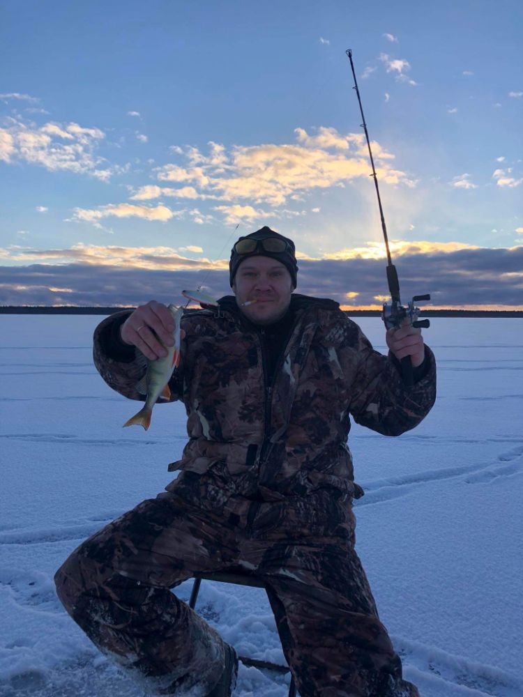 Тем не менее,через некоторое время удалось ещё раз чпокнуться,на этот раз сел добрый окунь,ура,удочку обновил!Затем,перед самым закатом опять флажок,и опять всё с той же лунки,уже 4-й!Вот это поворот