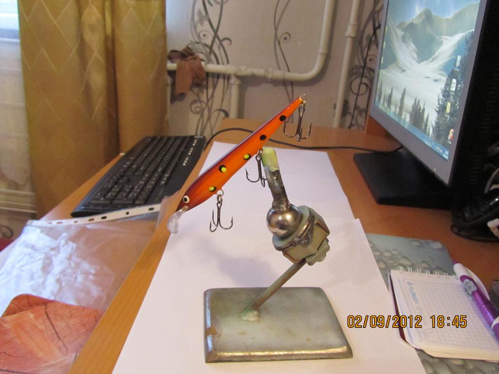 ... держак самый простой: можно на стол положить .... можно трафарет держать и быстро менять его, одна часть держится за петельку, вторая пальцем с держаком(чтоб не лапать лишний раз воблер руками, чтоб не было косяков при последующем лакировании)...