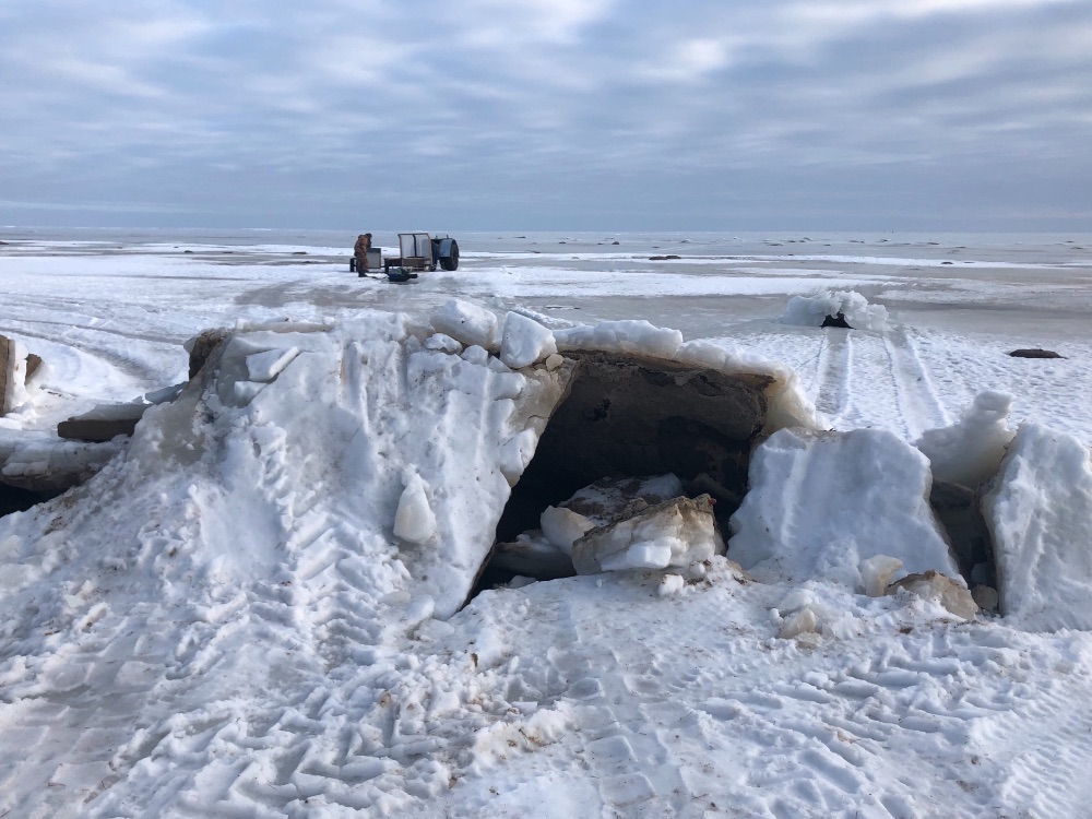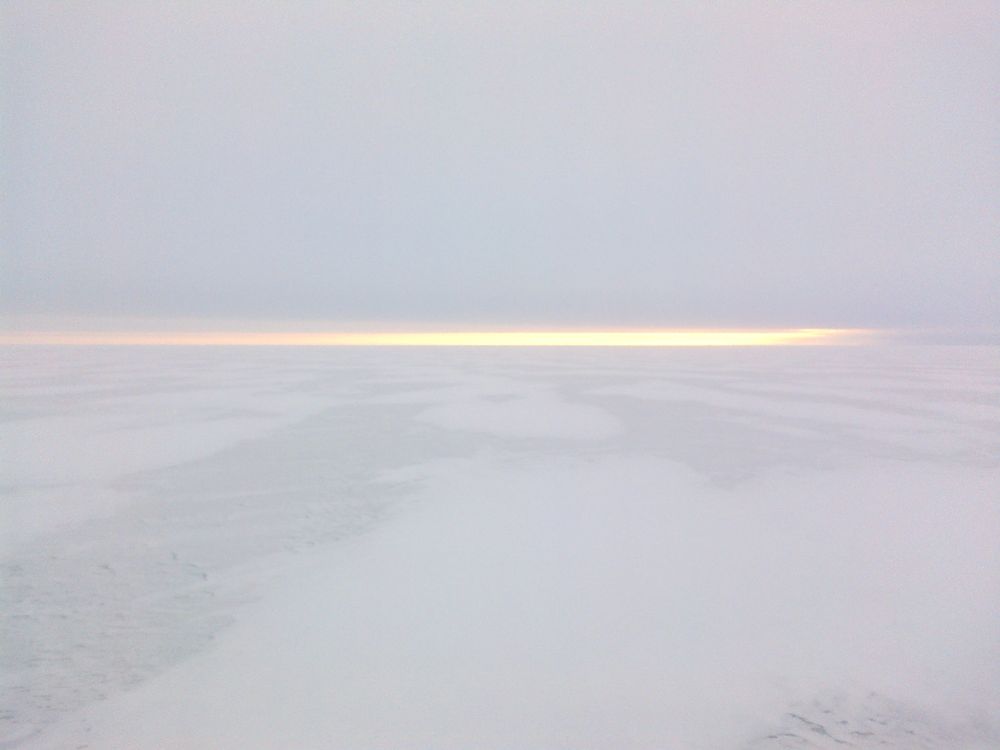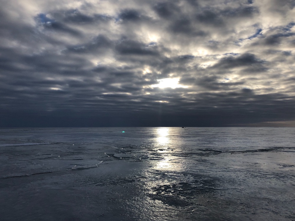 Пока одевались он скрылся из глаз и растворился во льдах озера. Выйдя на лёд по Геотрекеру шли тютелька в тютельку к нашему месту ловли в среду. Вышли точно, след палатки, лунки и Игорь который уже закормился по периметру в 15 метрах...