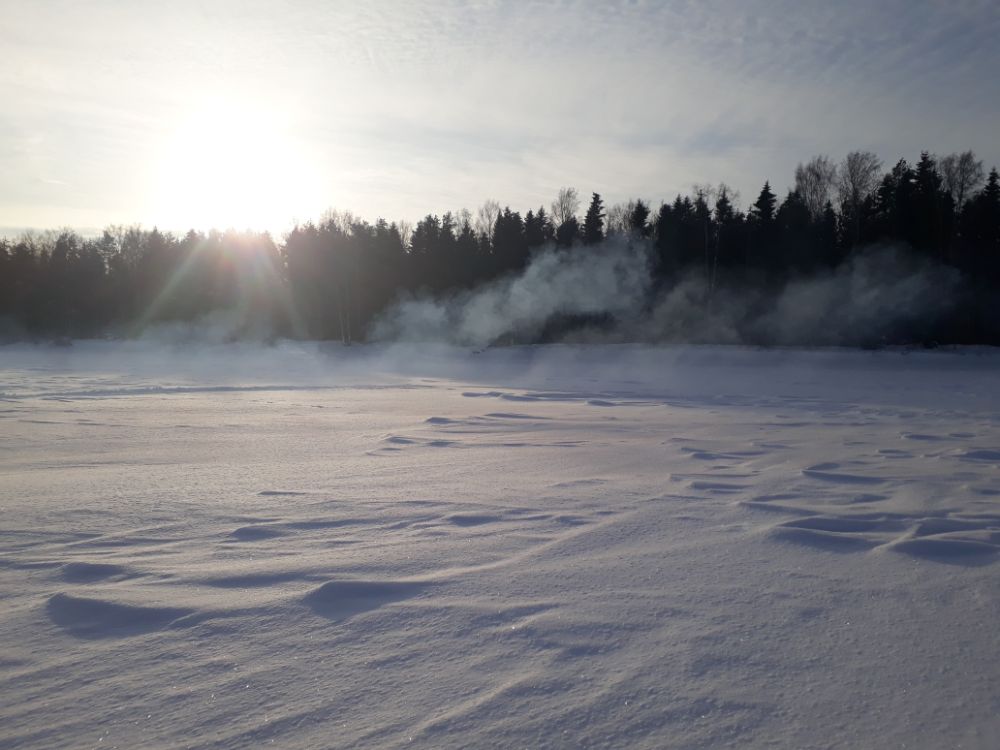 Получилось вчера выбраться на озеро, прогноз обещал шикарную погоду со слабеньким ветром, небольшим плюсом по температуре, сухо и даже солнечно в районе обеда. Утром, подъезжая под зарядом мокрого снега, в такой красивый прогноз верилось с трудом и напрасно! Погодка не подвела, днём над озером чистое небо, в стороне эстонского берега всё небо тёмно-синее.