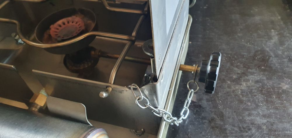 Бачок с горелкой можно вынуть из корпуса и весь корпус из чемоданчика собирается в кухню с ветрозащитой, которую легко перенести в другое место при необходимости так как боковые стенки на защёлках.