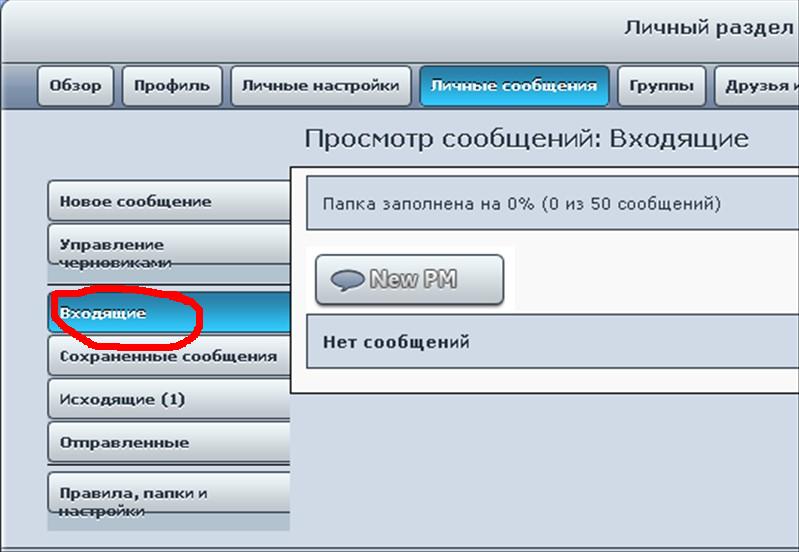 Кнопка "Личный раздел". Она рядом с кнопкой "НОВЫХ ЛС". Там закладка "Личные сообщения", и слева ищи пункт "Входящие". На него клац и откроются все личные сообщения что есть в почтовом ящике.