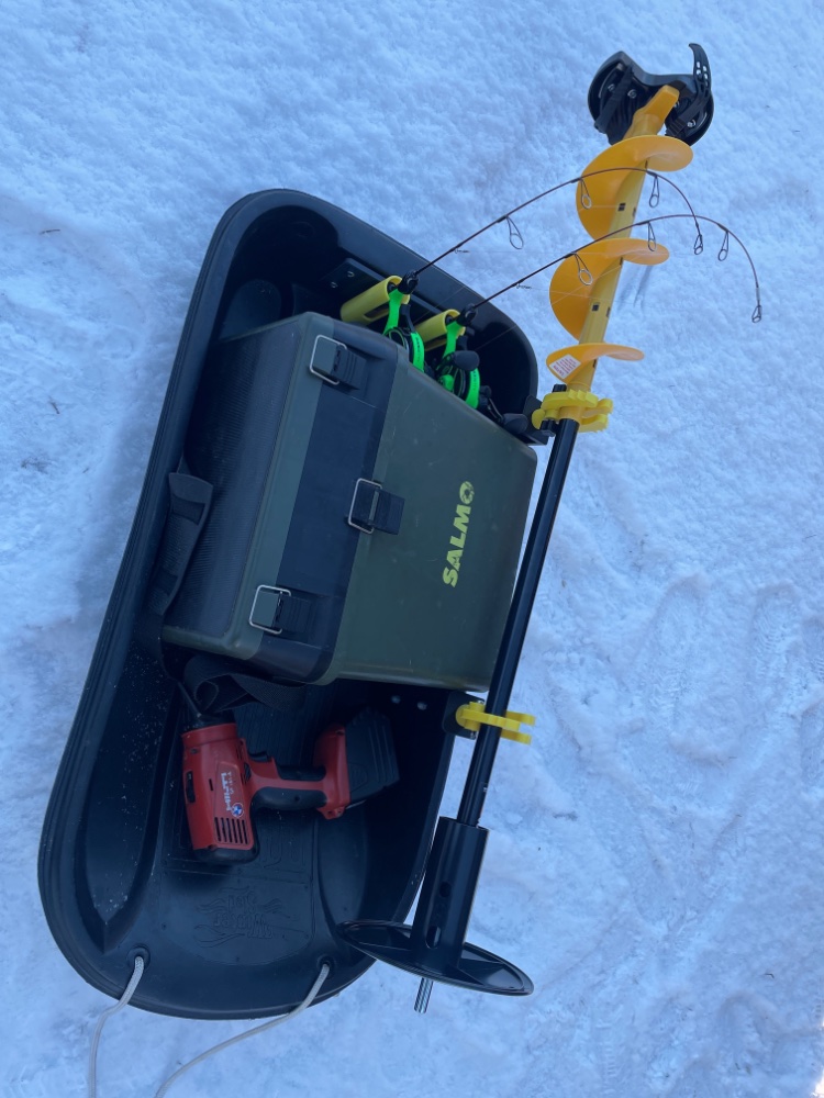 Люди - для лучшего скольжения, на деревянных проставках ножках, ставят мелкие лыжи слаломные, по бокам держаки в одном мото или электро буры - в другом палатка