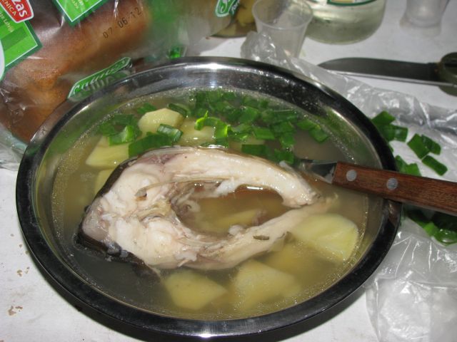 Еще одна нереализованная карповая поклевка, и звонок колокола рядом, Виталя секет, есть уха! Закилошный карпуша быстро разбирается на запчасти, картошечка сворованная у кабанчиков, солька, перчик, лаврушка, лучек, морковка, запах...