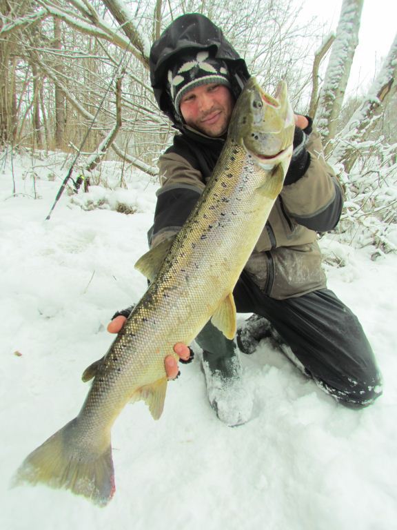 Поехал снова один. Воблерочек отсадил на первых ста метрах рыбалки. Интузязизм как-то сразу упал и повис. Собаки прогнали с первой ступеньки , пришлось ретироваться, чтобы не быть покусаным. Первый раз шел по этому участку и по этому не знал нрав овчарки и большого двортерьера черного цвета, которые ходили по моим следам и лаяли. Настрой упал от потери воблерка, больше такого не было. Пришлось кидаться как всегда старыми уловистыми приманками. Ноги стоптал до шеи. Посетил 5 бобровин , одну по шею. НО физ подготовка позволяла выпрыгнуть не промокнув. ни поклевки. Убит, расстроен, растерзан. Назад пошел по полю и по трассе, пришел в пене, к машине по колено в сугробах с настроением уехать на х.... ближе к дому. А тут знакомая машинка нарисовалась. Человек пошел по моим следам, и у самой машины от куда меня прогнали собаки с утра, поймал 2 рыбки 3.700 и еще одна за трешку, я плакал. И он идет назад а собаки не лают, подбежала понюхала и пошла дальше, это меня добило , я уже собрался домой. НО приняли решение переехать. переехали, я его вывожу на место где по большой воде мы не смогли пройти, а вчера я в ботиночках, там тоже не рискнул, шагаешь на лед а он проваливается, и не известно куда. НО сегодня я в сапогах, вооружен и опасен. Иду первый, и ловлю две чуть ли не подряд бобровины. В одну провалился сильно и силы меня покинули. Пока вылазил напарник становится на слив, и говорит что была поклевка, я его успокаиваю может показалось. Но советую поменять воблер.И нахрена я это сделал, он тут же ловит еще одну трешку самую маленькую, 3.300.