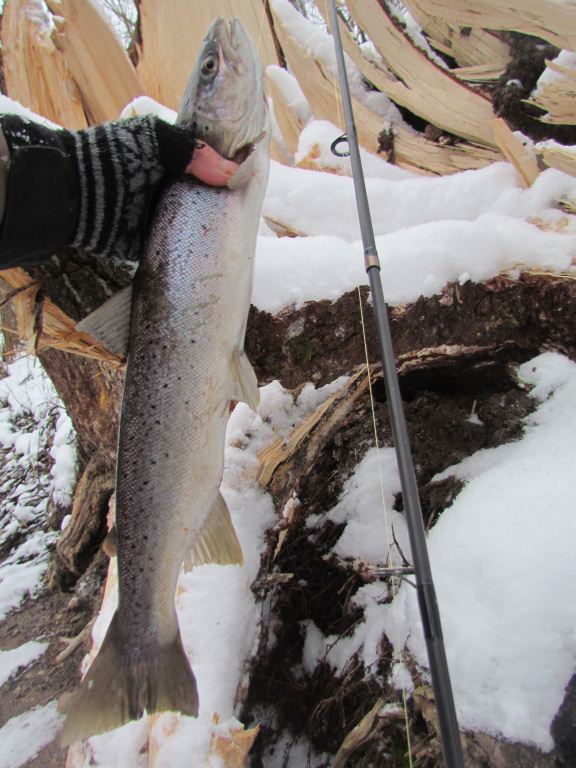 Поехал снова один. Воблерочек отсадил на первых ста метрах рыбалки. Интузязизм как-то сразу упал и повис. Собаки прогнали с первой ступеньки , пришлось ретироваться, чтобы не быть покусаным. Первый раз шел по этому участку и по этому не знал нрав овчарки и большого двортерьера черного цвета, которые ходили по моим следам и лаяли. Настрой упал от потери воблерка, больше такого не было. Пришлось кидаться как всегда старыми уловистыми приманками. Ноги стоптал до шеи. Посетил 5 бобровин , одну по шею. НО физ подготовка позволяла выпрыгнуть не промокнув. ни поклевки. Убит, расстроен, растерзан. Назад пошел по полю и по трассе, пришел в пене, к машине по колено в сугробах с настроением уехать на х.... ближе к дому. А тут знакомая машинка нарисовалась. Человек пошел по моим следам, и у самой машины от куда меня прогнали собаки с утра, поймал 2 рыбки 3.700 и еще одна за трешку, я плакал. И он идет назад а собаки не лают, подбежала понюхала и пошла дальше, это меня добило , я уже собрался домой. НО приняли решение переехать. переехали, я его вывожу на место где по большой воде мы не смогли пройти, а вчера я в ботиночках, там тоже не рискнул, шагаешь на лед а он проваливается, и не известно куда. НО сегодня я в сапогах, вооружен и опасен. Иду первый, и ловлю две чуть ли не подряд бобровины. В одну провалился сильно и силы меня покинули. Пока вылазил напарник становится на слив, и говорит что была поклевка, я его успокаиваю может показалось. Но советую поменять воблер.И нахрена я это сделал, он тут же ловит еще одну трешку самую маленькую, 3.300.