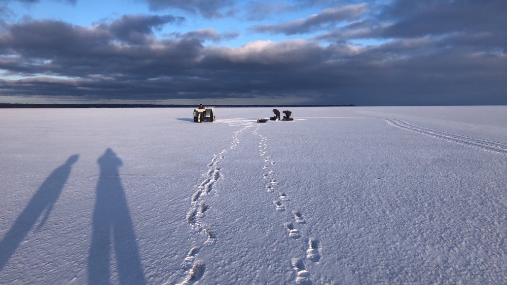 Выспавшись и полотно позавтракав, выдвинулись на озеро. Погода - красота! Но ночной снег внёс свои коррективы - все былые точки оказались скрыты под слоем пушистого снега. Пришлось искать ориентиры, сверяться по трекам ГПС, короче вычислять где клюёт рыба