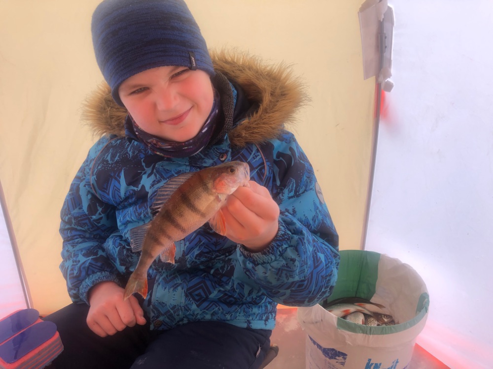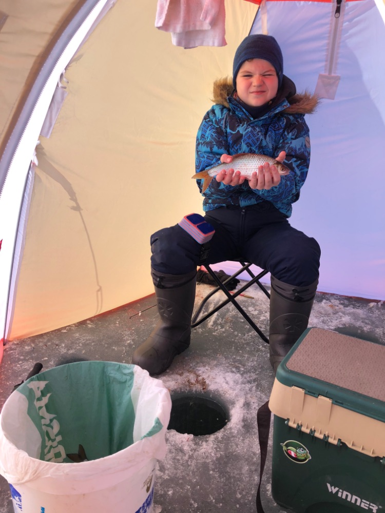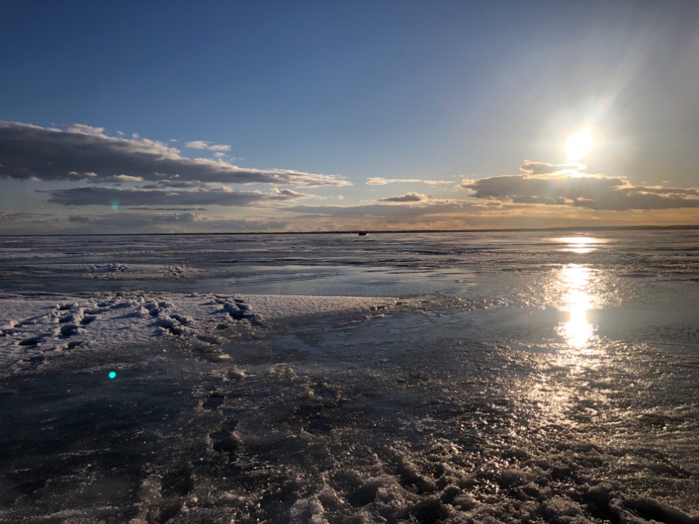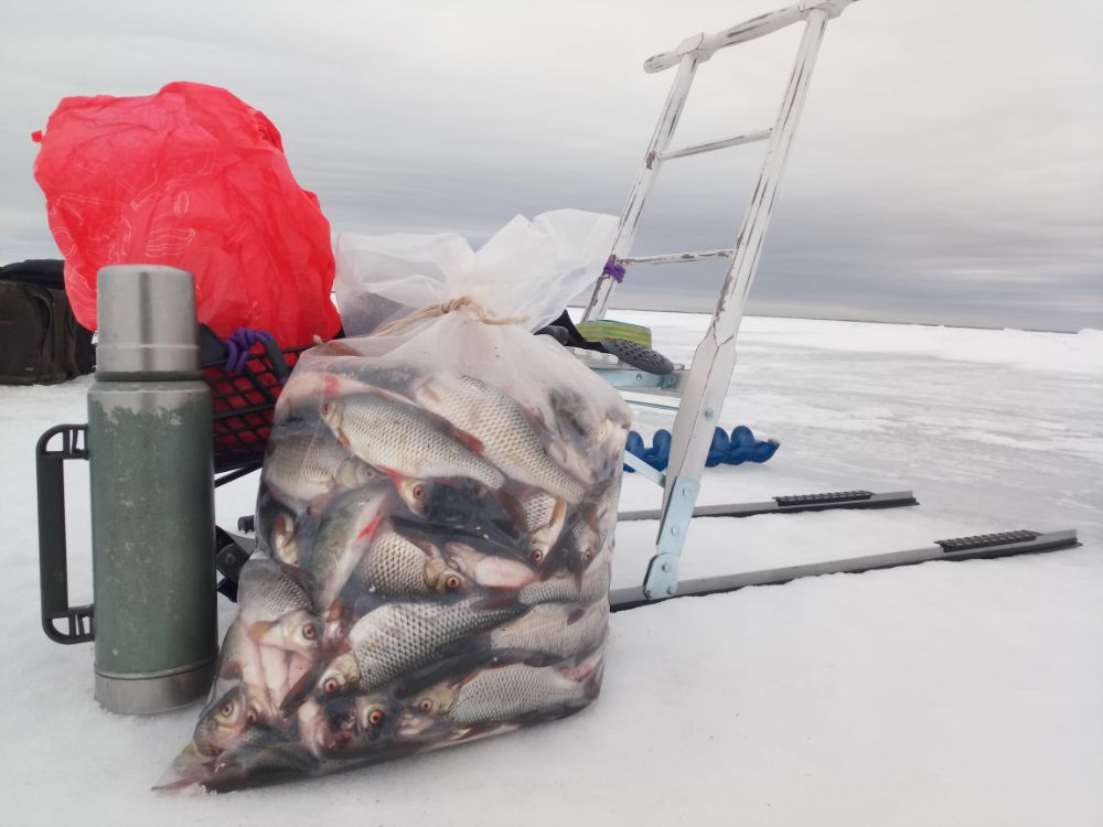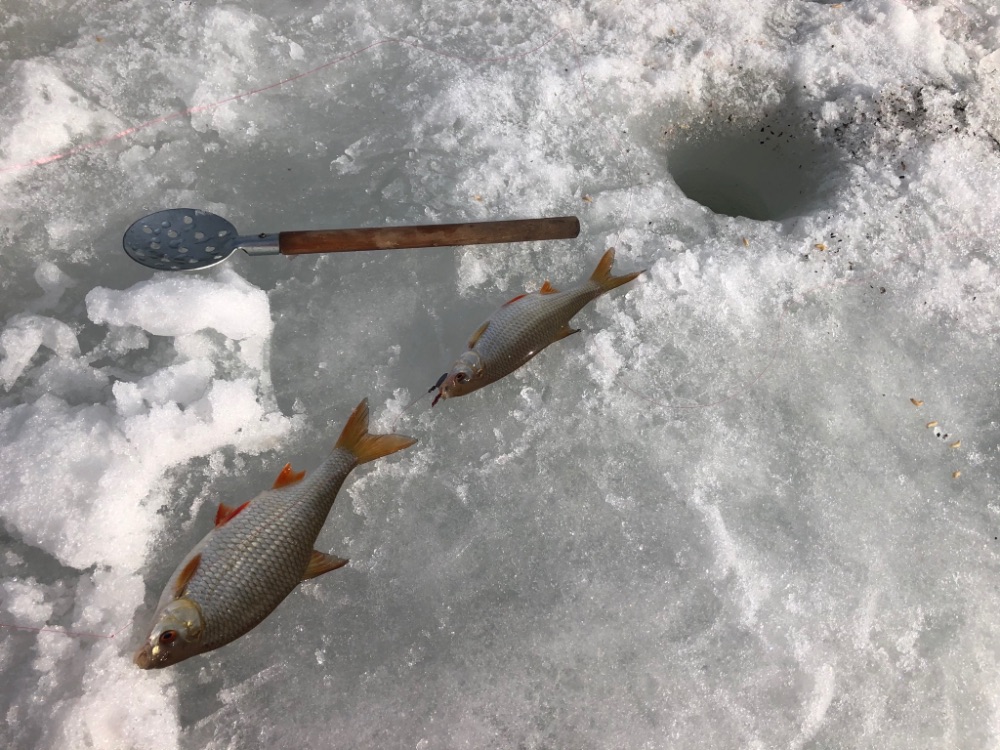 После обеда вышло солнце, хоть ветер и не стихал, ловить было комфортно. Вокруг никого не было, поджопники в этот раз обошли нас стороной. В какой-то момент со стороны границы подъехал снежик, но предусмотрительно остановился довольно далеко от нас. Было видно что человек адекватный, не то что некоторые. Немного посверлив он отчалил назад, в сторону границы.