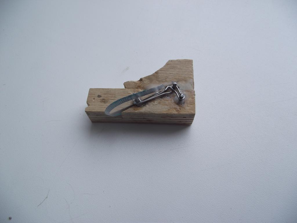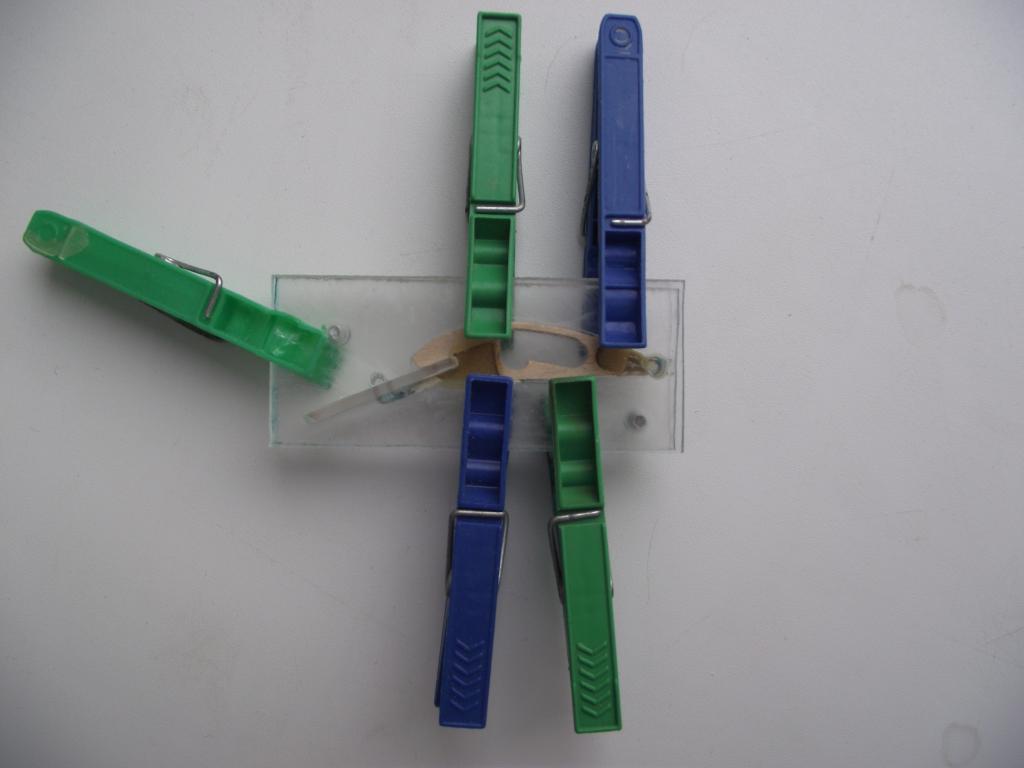 7. Ставим в стапель центральную пластину корпуса воблера и лопасть с каркасом. Так же заднюю петлю. Уплотняем зазоры от растекания смолы. Заливаем эпоксидкой (в смеси с опилками) проволочную арматуру в местах выборок по верхнюю кромку средней пластины стапеля. Закрываем верхней пластиной. Зажимаем и ждём когда встанет.