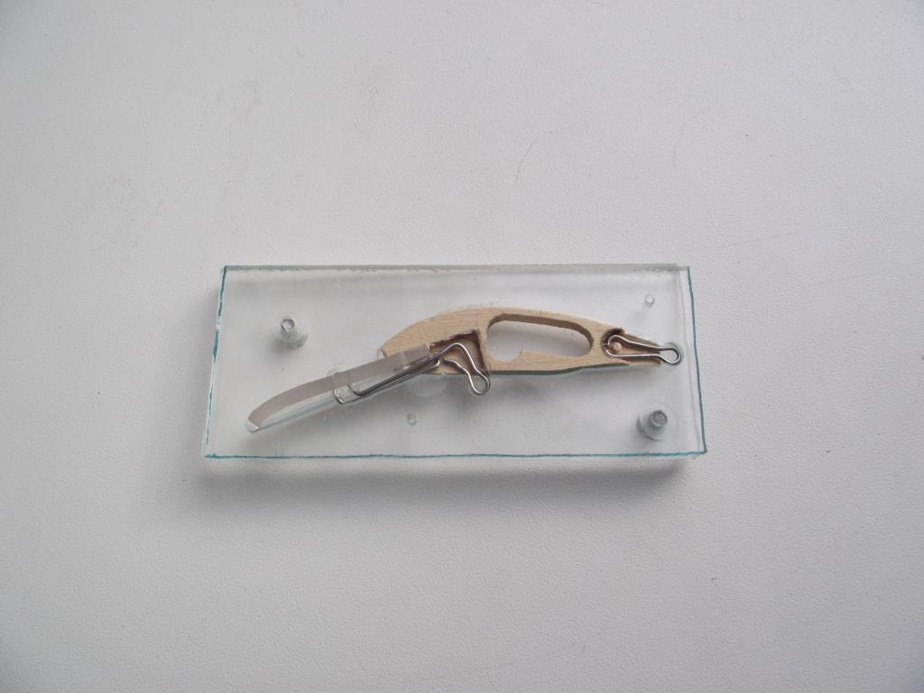 4. Изготавливаем индивидуальную приспособу для сборки воблера, я зову её «стапель». Три пластины из оргстекла 3мм (толщинаопределяется конструкцией воблера) и не принципиальна. Толщина средней обуславливается принятой толщиной центральной пластины корпуса воблера. В нижней и верхней только сквозные пропилы под лопасть толщиной 2мм (у меня лопасть из поликарбоната). В средней – выпилен вид «с боку» с лопастью. Всё разъёмное - нижняя и средняя пластины соединены болтами М3. В средней с помощью фрезы сделаны выборки под петли – переднюю, нижнюю, заднюю и под проволоки каркаса от передней петли под лопастью. В верхней пластине приклеены заглушки в соответствующих местах под выборки. Их функции – центрирование проволочных петель и частично предотвращение затекания смолы. Для не затекания применяю так же уплотнение разделительным составом. Ну, в общем, намаялся с этой конструкцией. На фото второй вариант – первый сломал. Наверное, возможны и другие варианты конструкции стапеля. 5. Берем заготовку из древесины (у меня липа толщиной 3 мм) по размеру воблера с припуском на обработку. Фиксируем на ней металлический шаблон. Обрабатываем. Металлический шаблон обеспечивает одинаковость получаемых деталей. Снимаем с шаблона, наносим по другому шаблону контуры выборок под проволочный каркас (спереди-снизу и сзади) и выполняем выборки (снимаем 2 мм) фрезой (дремель или кому что нравится). 6. Изготавливаем лопасть (у меня поликарбонат). Собираем на кондукторе лопасть с проволочным каркасом.