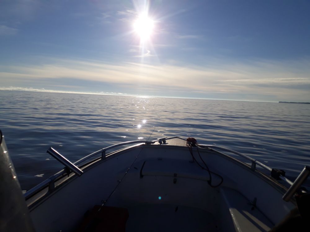 В эту субботу , начало , пока солнце не вышло , поклевки одна за одной , но размер ниже среднего , потом , по одному и то с разных направлений , стаи просто нет , смена мест ни чего не изменила , пробовал на малом ходу в сторону дома , найти скопление рыб в течении полу часа , не за что было глазу зацепится , что то грустно нынче , парни выходили в восресенье у двух экипажей и в разных местах и разному подходу к рыбалке , результат одинаковый.