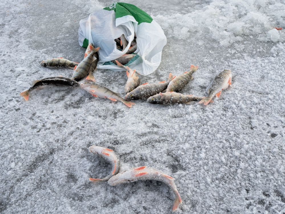 Окуни поклёвывали не особо активно, стайного вообще до обеда не обнаружил, 2-5 с лунки в лучшем случае. У меня на чистом льду по нолям, всё в снеговых кучах, причём чем они старее и больше, тем лучше результат. Размер тоже не радовал, как обычно в этом сезоне, из трёх вытащенных - два обратно. А вот около двух часов дня повеселело, регулярно стали брать двухсотграммовики.
