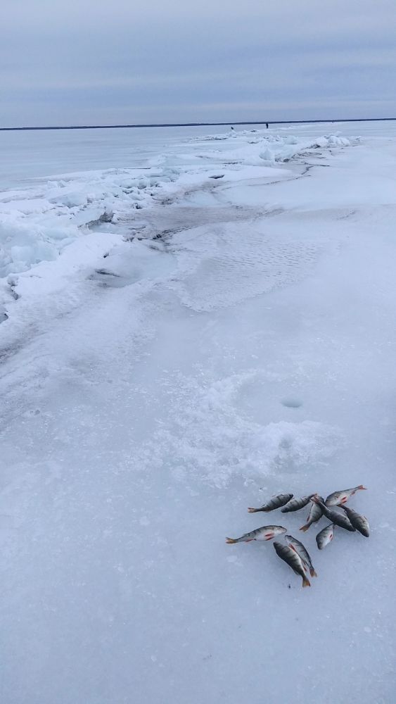 Воскресенье, утром погода наладилась, южный ветер 6-7м/с, температура +1 градус. Окушки стали поклёвывать, как обычно, много мелочи. Убежал выше, на торос на четвёртом км, там практически тоже самое. К обеду клёв заметно ухудшился. Народ потянулся к берегу, В проезжающем недалеко снегоходе, опознал Вадима нарвского, чуток пообщались, а после его отъезда я изловил самого крупного окуня на этой рыбалке, 530 гр. После 14.00. рыба совсем скурвилась и в 16.00. были уже на берегу. 6 кг полосатиков уехали со мною.