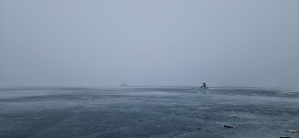 С 13 совсем тишина, свалили бы, но пёхом идти лень, а туман стоит... Тридцатку на двоих взяли, отдохнули, мормышки помочили, а чего ещё надо? День прошёл хорошо, но вот тумана бы ещё не было.
