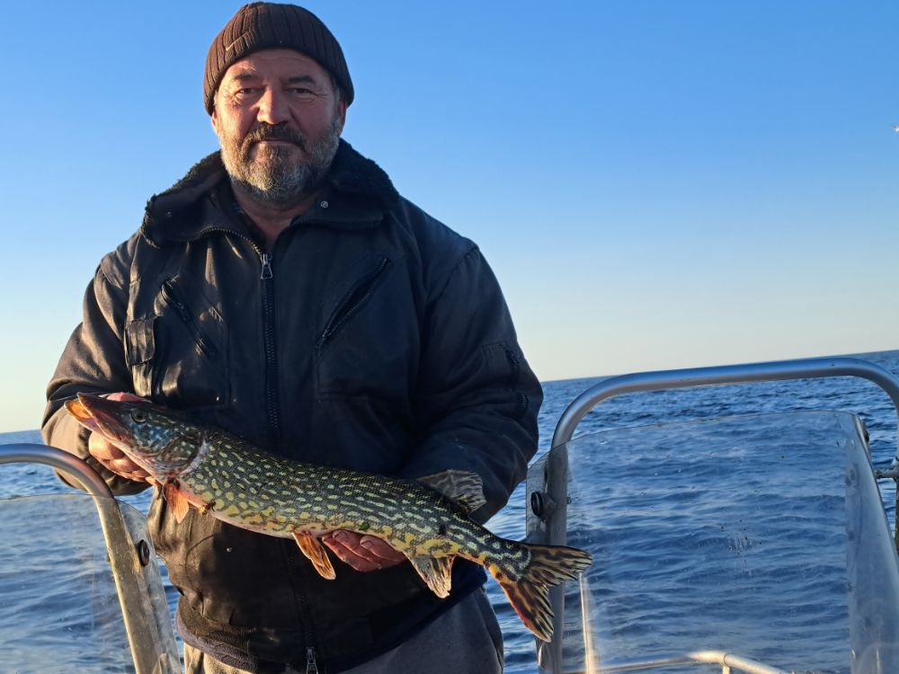 Вчера поинтереснее. Окунь проскакивает приличного размера, грамм по 500-600, щука цепляется регулярно. Правда размер мелковат. Взяли парочку килошек, остальное за борт. Правда было пару сходов хороших. Или окуни килограмовики или щуки покрупнее.Погода не подкачала. С утра маленько побрызгало, потом сухо, лёгкий ветерок и под конец солнце. Клёв не прекращался пока не уехали. Можно было сидеть до вечера.