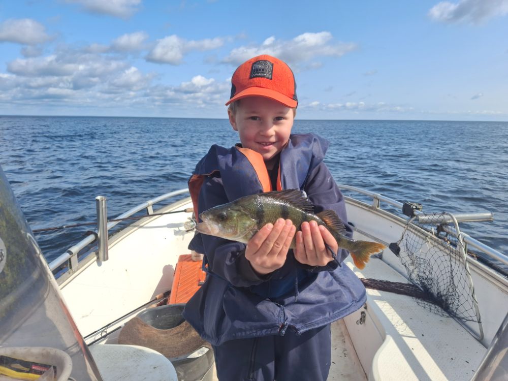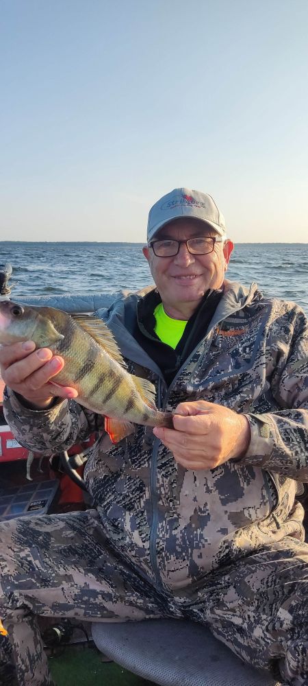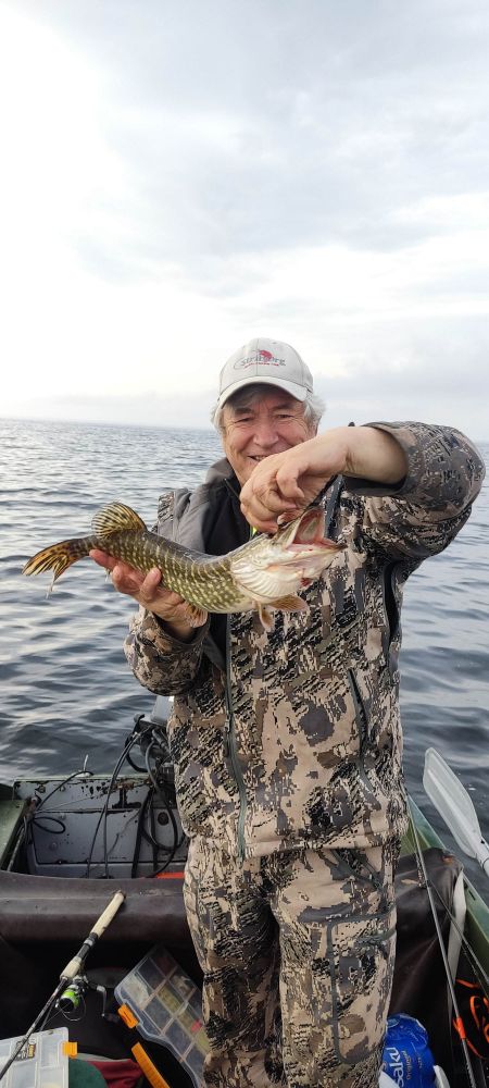 Начали поиск два км от берега, закончили на четвертом. Обновил новый костюм, подышал чистым во́здухом, половил рыбку. Клёв был не особо активным, только после полудня активизировался на час-полтора. Мелочи до 100 грамм отпустил штук 50. Потом вытащил зубастую на 4,6 кг. Повезло, ещё бы сантиметр и леска пришлась бы на зубы. Сел пообедать, а окуни не давали