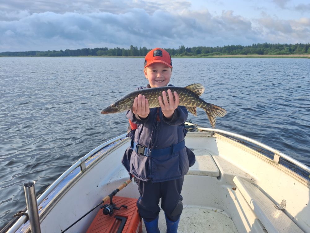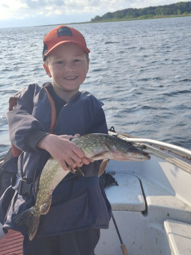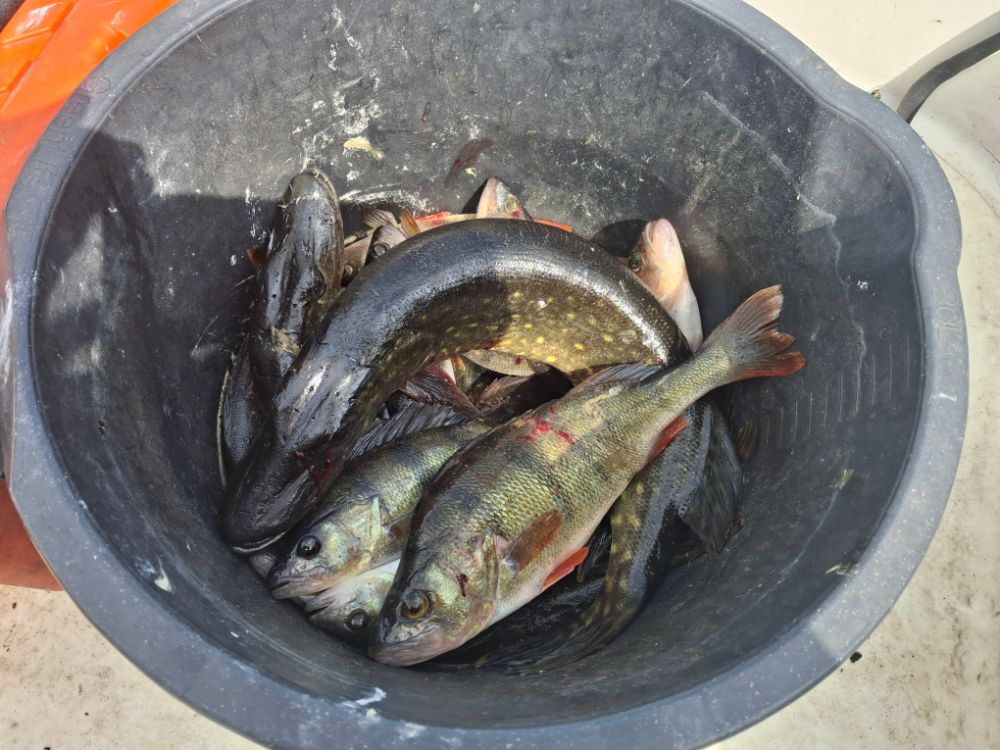 У напарника на третьем забросе щучка , следом окуни , ну щучка между делом . Ветер тащил лодку вдоль берега , так что было удобно , не заводились как неслотак и кидали , вся рыба в заброс , пару гарбузов слили , не подняли в лодку .