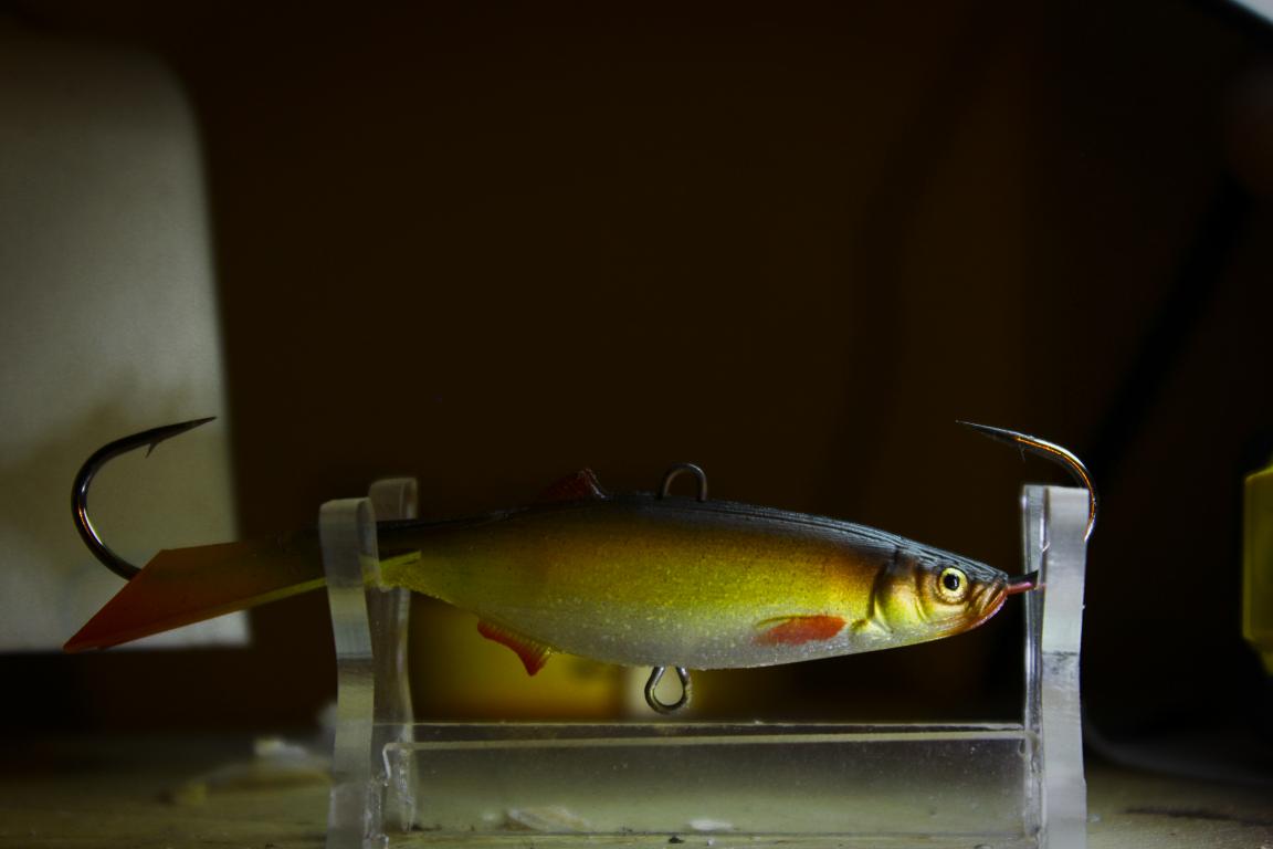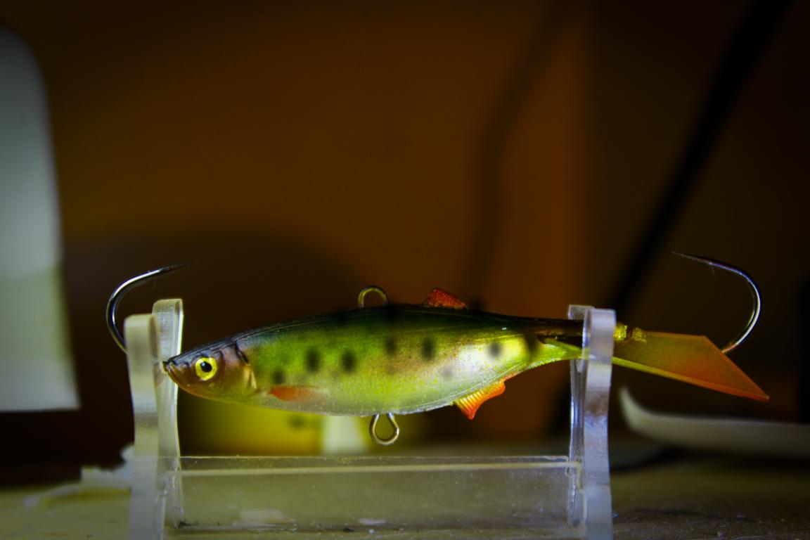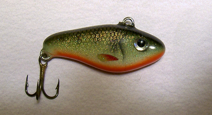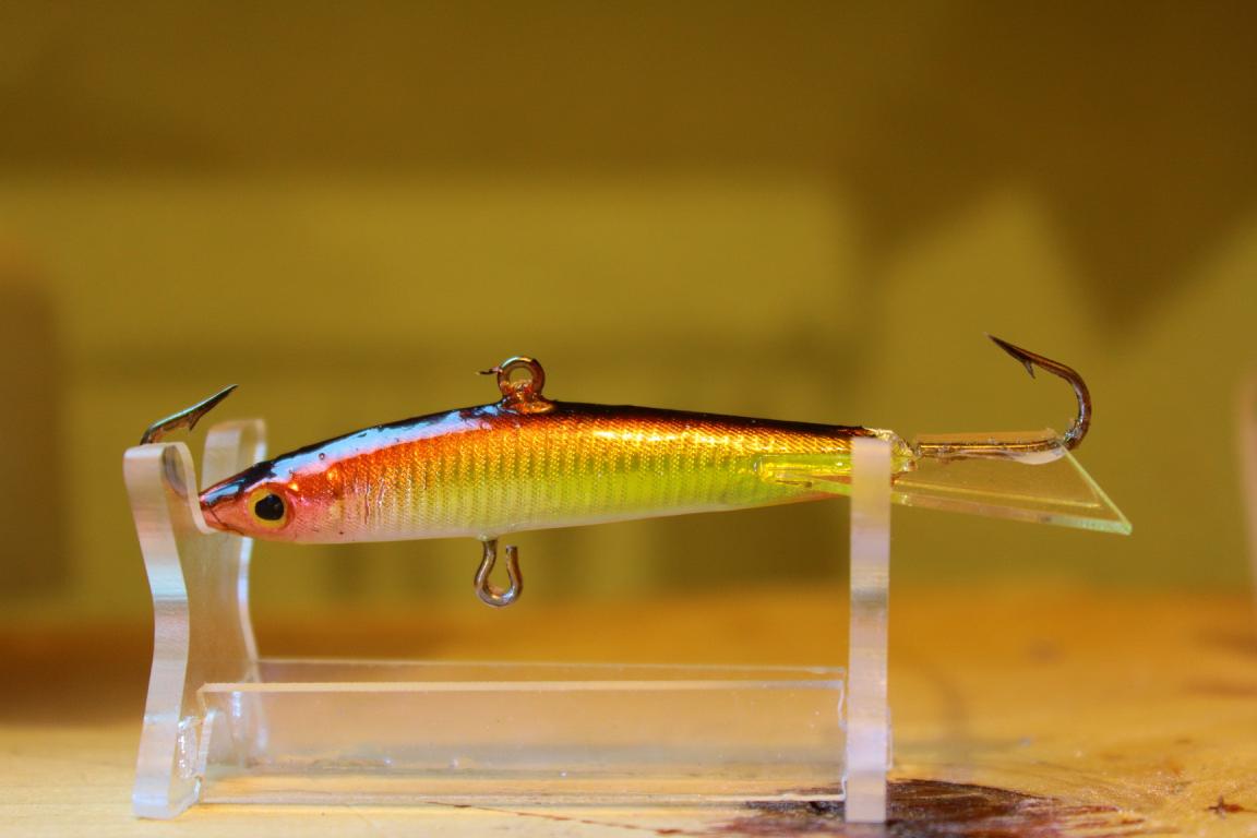 По форме он скорее утолщённый раттлин. Сделан из твёрдого плавающего пенопласта. Пробовал делать из тонущих материалов тело, не играет. Между плавником и жаброй засверлил почти вертикальное отверстие и вставил туда тело от вольфрамовой мормышки-капли. При погружении в воду делал что бы он находился почти вертикально, с маааленьким наклоном носа. Если сделать совсем вертикальное положение уход в сторону уменьшается.