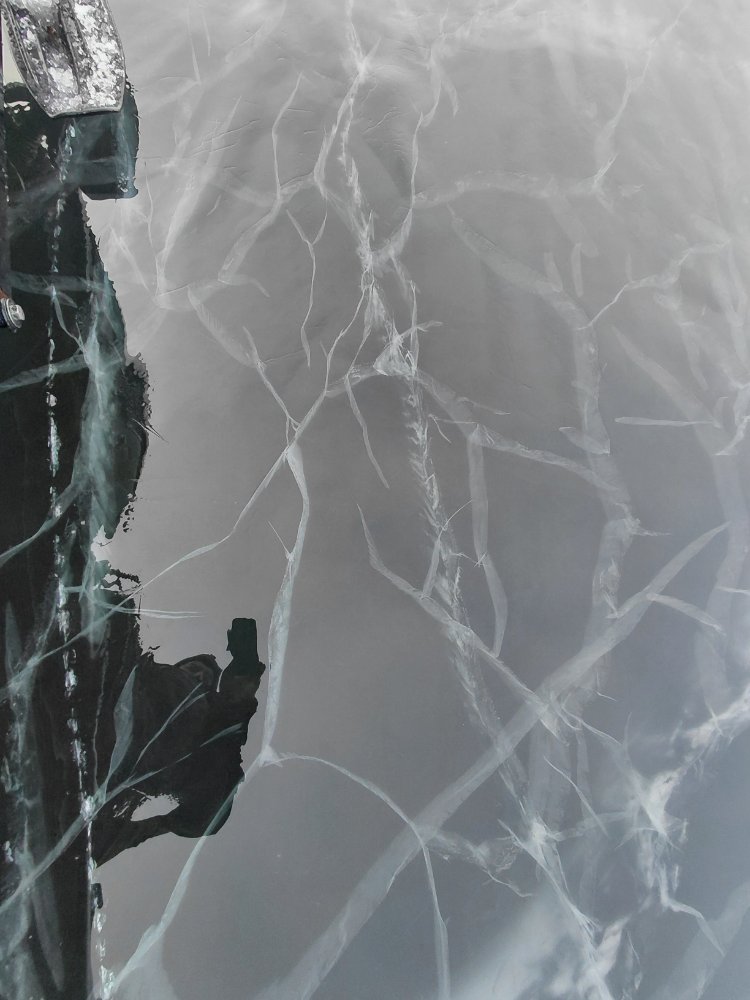 Поехал туда же, на север. Прошли от берега метров 600 и вот она, трещина живая, сдавленная и весьма неприятно выглядящая, чтобы безопасно перебраться, прошли вдоль неё с полкилометра.