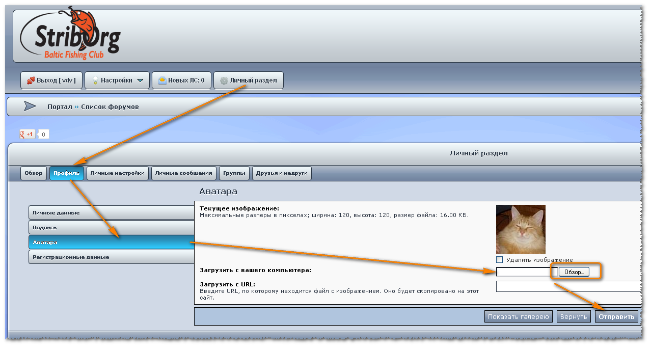 Заходишь в личный раздел, затем в профиль, там, в аватару, там кликаешь обзор и находишь на своем компе нужную фотку, потом "отправить"