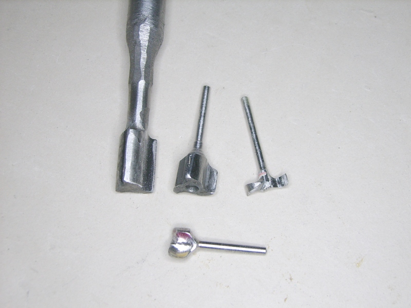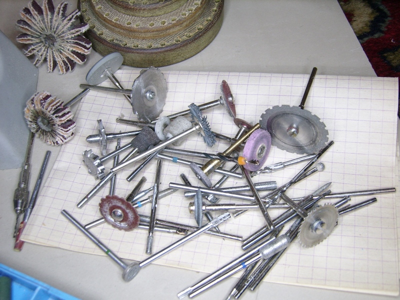 На первых -в основном, свежая (не более 2-хмесячной давности, кроме 2-х более ранних фрез) самодельная расходка. Самая-самая фреза сделана совместными усилиями токарного станка и китайской бормашинки (сделал под машинку оправку, чтобы можно было крепить в резцедержателе) -первая фотка.