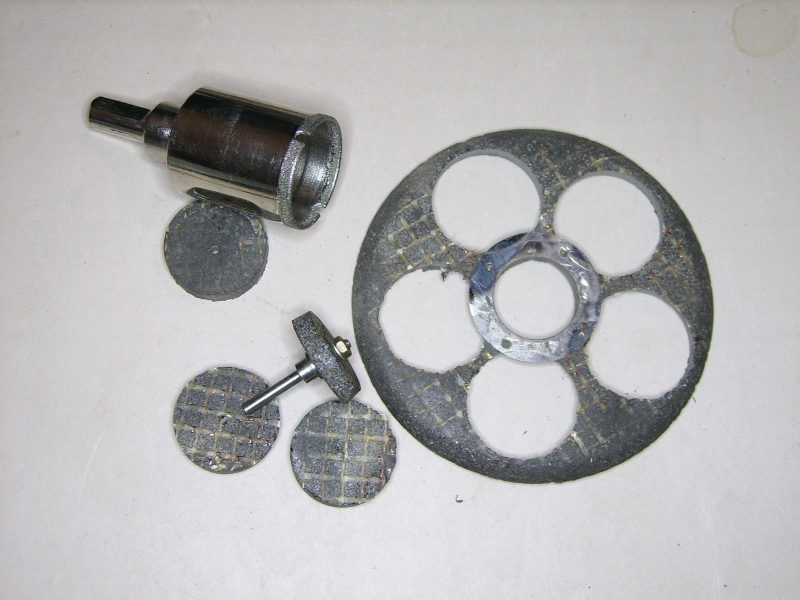 Ещё кружки, нарезанные из огрызка болгарочного зачистного круга, их вырезал алмазной кольцевой коронкой (диаметр ок. 30 мм., ц. ок. 200 руб.), возможно, труба тоже бы справилась, но не с такой скоростью (около 4-7 сек. на прорезание 5-и мм. круга).