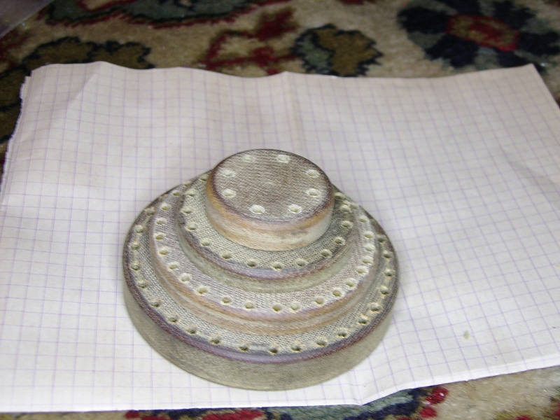 Затем - шлифовальные круги, нарезанные из большого отрезного круга (с помощью обычной трубы с коронкой на торце. Труба зажималась в патрон токарного станка, а отрезной круг прижимался к ней с помощью задней бабки, обороты выставлял небольшие, а давил шустро, чтобы торец трубы не успевал снашиваться).
