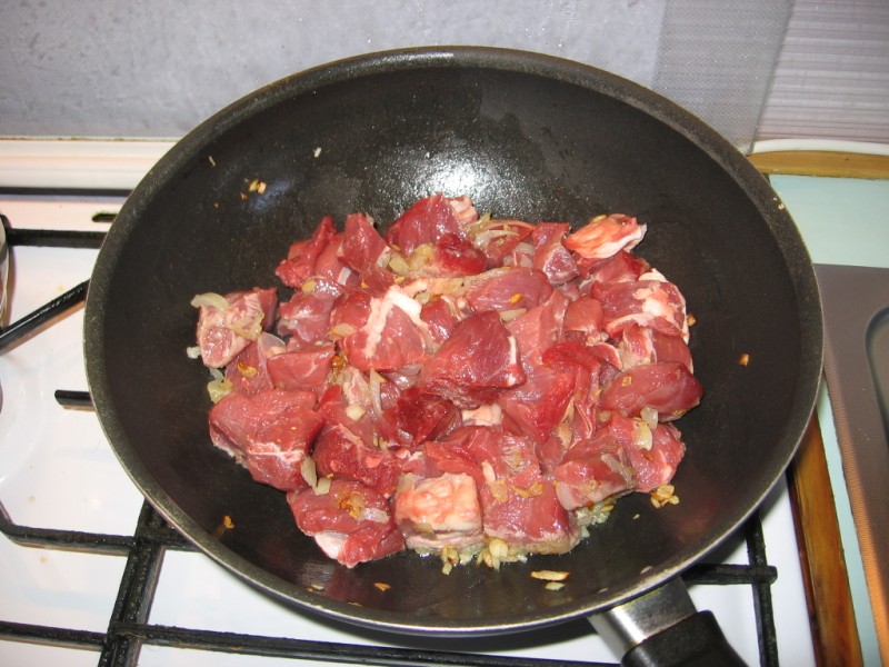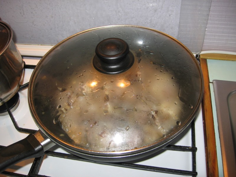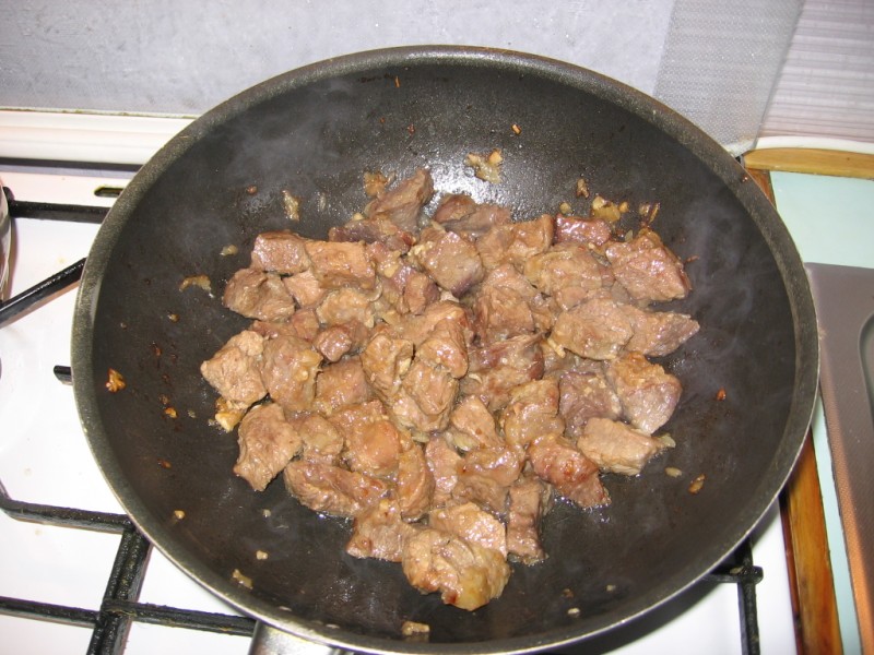 Ложим мясо в сковородки и тушим-жарим пока не выкипит выделившийся сок