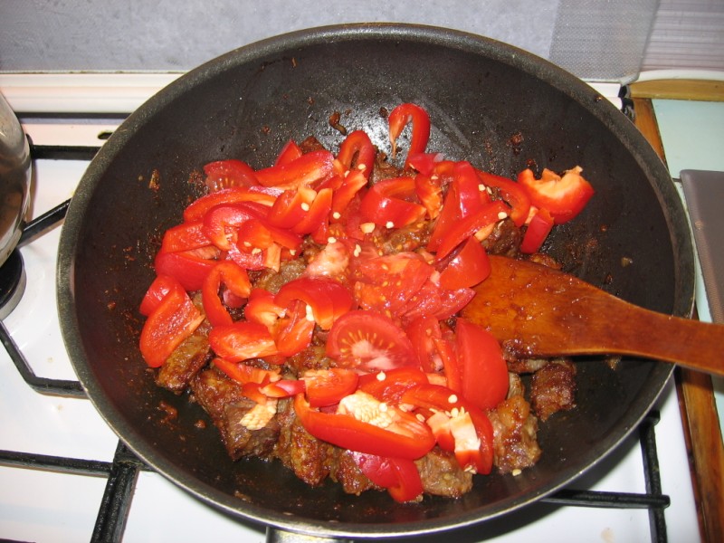Потом добавляем порезанную паприку,помидоры