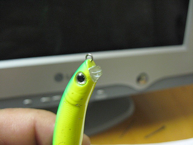 , щелкнул ее о борт и просто тупо отлетел изрядный кусок пластмассы, одна четвертая часть, что за невезуха пошла. Буду вклеивать или паять кусог пластмассы с другого, неуловистого воблера