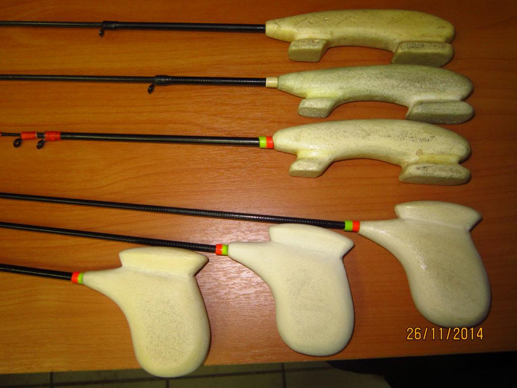 Вот мои любимые формы удочек для блеснения на Ладоге и Заливе. Ручка из пенопласта, хлыст уголек.делаю двух или трех коленный. жесткость разная получается и удобно в перевозке.