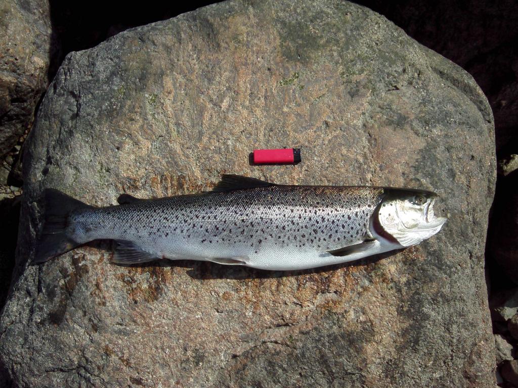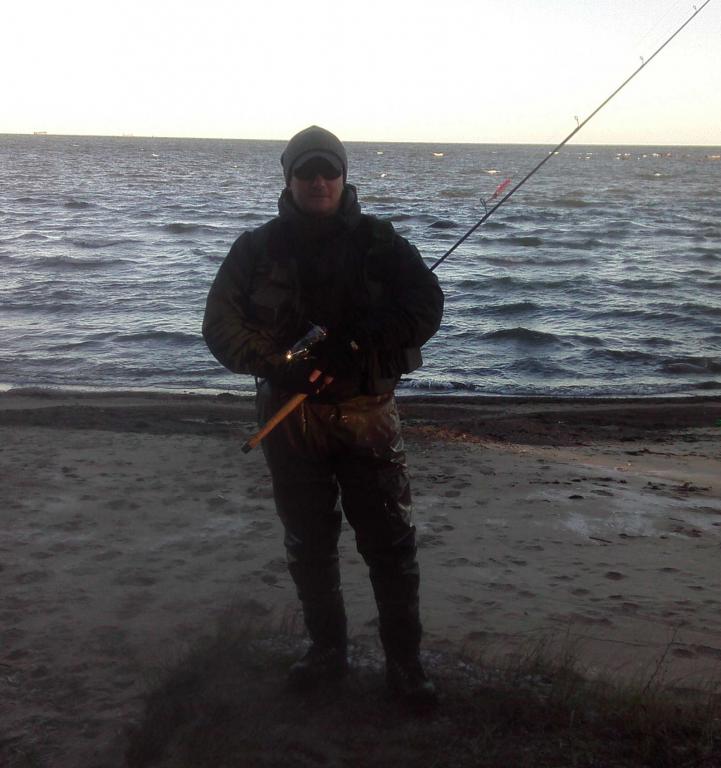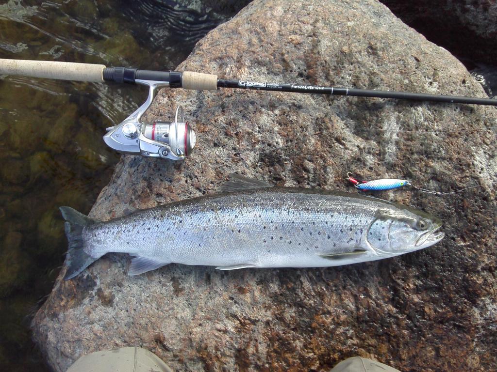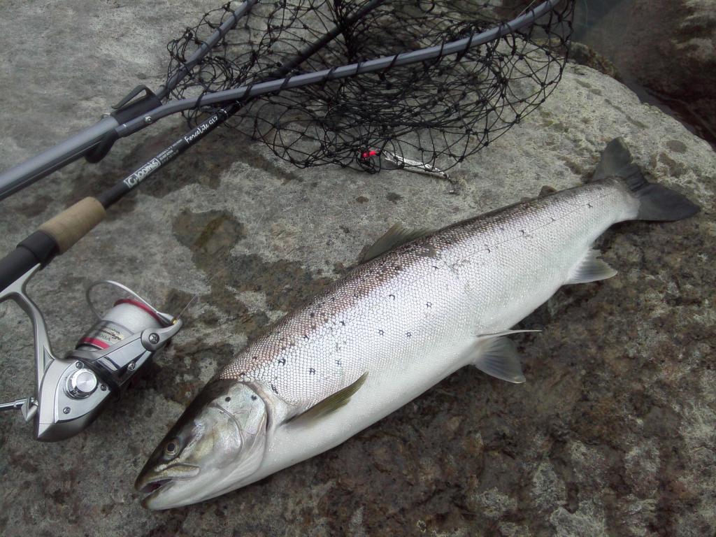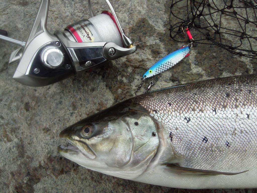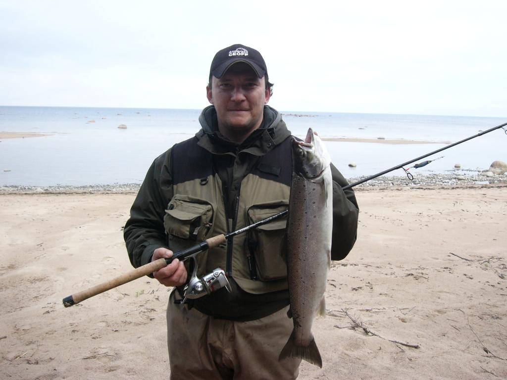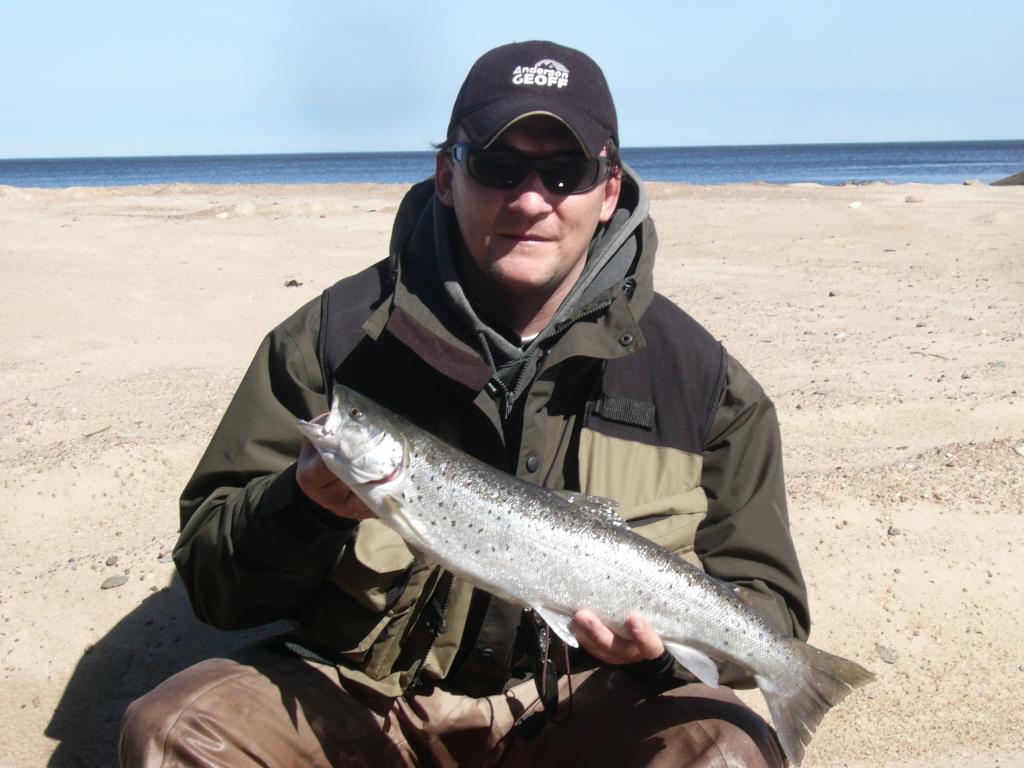 Сегодня с приятелем уже в семь утра были заливе. Погода плохая. Дождь,туман,северо- восточный ветер. Приличный отлив. Воды очень мало.Решили закрыть сезон и все-таки половить. Разошлись по точкам и приступили. В 9 утра слышу молодецкий свист, напарник рыбу тащит и причем хорошую. Быстренько применили сачек и пошло взвешивание. кумжа весом 2.9 кг. У приятеля это первая кумжа на заливе. Рыбка клюнула прожорливая.В пузе насчитали 5 салак 8-9 см.