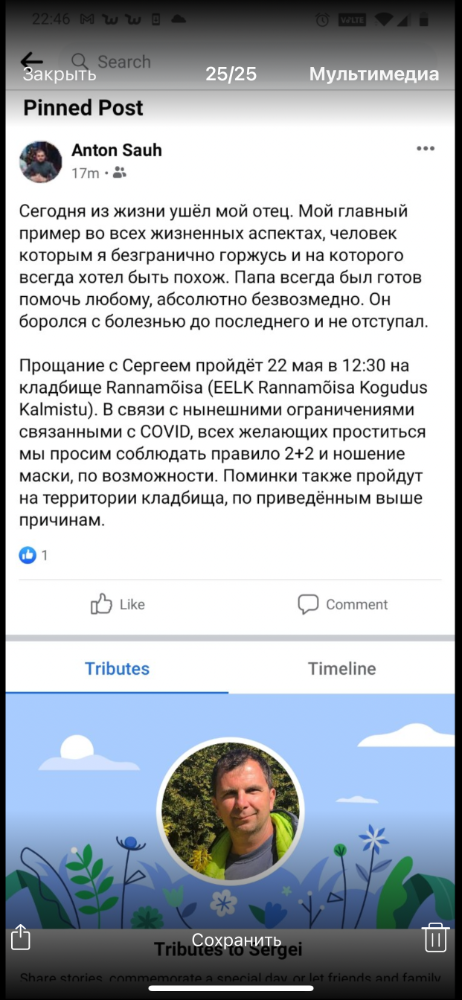 Созвонился с родственниками. Прощание 23.03. 14.00 от морга портовой больницы. Там же похоронное бюро. Потом кремация тела в Маарду. В похоронное бюро из за вируса больше пяти не пускают. Планирую там венок передать.Если кто сможет подьезжайте.