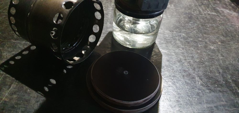Когда последний раз сидел в палатке с "реактором", нижняя металлическая пластина протопила лёд и вмерзнуть даже успела. Заменил на подставку из водостойкой фанеры. Внутреннюю юбку на которой стояла банка, распилил на лепестки и теперь банка плотно фиксируется в корпусе из нержавейки от термоса. Пружины теперь не нужны банка зажата в корпусе опираясь на фанерный диск, не выпадает если поднять за радиатор. Сам корпус подрезал на один ряд отверстий.