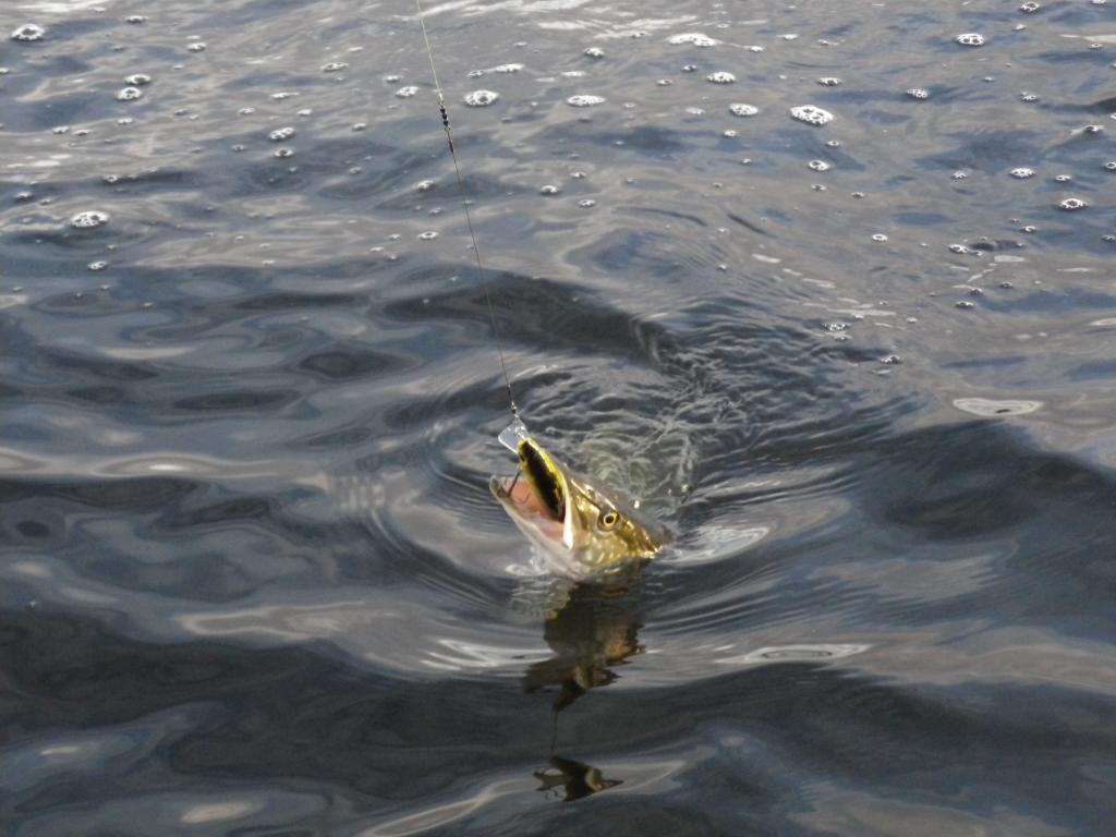 Утром выбрались на залив, на рассвете вышли. Воды на 30 см ниже чем надо. Ветер слабый, в залив, что тоже не есть хорошо, правда пасмурно. Ну да ладно, раз приехали, надо бороться. Рыб впал в сонное состояние и просыпаться не был намерен. По несколько выходов, поклевок и сходов все-таки вымучили. Одна полторашка уже была подведена к лодке. Вертушка вся в пасти, отказываюсь от помощи с подсаком. У лодки начинает бросаться, да так бодренько, в руки не дается. На пятый бросок из пасти показываются два крючка, на шестой, совершенный в противоход выбивает последний и застывает на долгие несколько секунд, видимо не веря в свое освобождение, или стараясь меня запомнить, чтобы в следующий раз рассчитаться за все