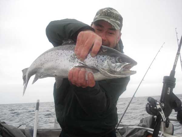 Погода была неустойчивая и ветер постоянно менял направление, да и вода еще 13 градусов. Клевало на зелено-синий цвет. На фото лосось 4250гр.