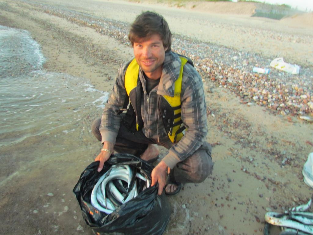 Поналовив на свою опу приключений в прямом и переносном смысле я её всетаки приволок к месту сброса. Все ещё собирали вещи и делали взвешивание улова. Дима оказался впереди бригады всей с тридцатью килограммами сарганов.