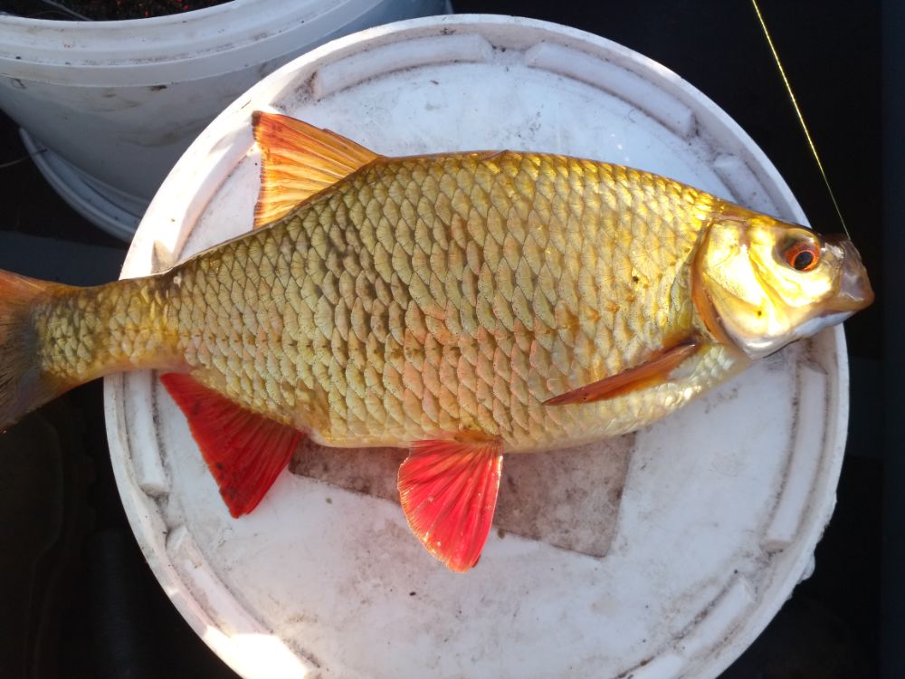Перед рассветом влетел один закилошный лещ. Вышло солнце. Всё тот же линь, весь в пузырях, стоящий на прикорме. Краснопер выносящий мозги. К слову о ней. Размер очень не плохой. Так что кто её жалует. Велком на водохрон, в тросту и ловите на здоровье. Около 7 утра приподнял садок с сиротой лещем. Развязал. Он очумелый, немного постоял, прощаясь у лодки и так же удивленно, медленно, ещё не веря вновь обретенной свободе, поплыл в родную стихию до новых встречь.