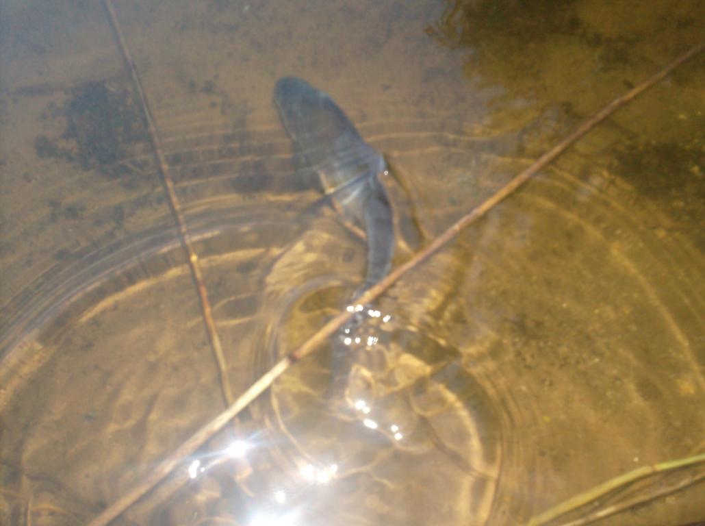 Доехал сегодня до любимого ручейка, залез в самые травы да кусты и начал обследовать водоёмчик. опробовал шляпу с сеткой, спасибо за подарок - оказалась вполне рабочая вещь. Первой отозвалась молодая, но очень резвая щука, чуть не дотянувшая до нормы. Пару раз загружала ул до звона, пытаясь убежать в коряги. Поскольку взяла ниже бобровой плотины, где форели уже практически не осталось, была аккуратно снята с тройника и отпущена гонять мелких окуней, коих там расплодилось прилично. Потом перебрался выше уже просто большой плотины, высота ее почтив мой рост, вода проходит сквозь нее тоненьким ручейком. Выше воды еще прибыло и сейчас там средняя глубина полтора метра, не считая ила. Для этого ручейка уже критично. В воду не залезть, а с берега участок ловли очень небольшой. Вода стоит даже в поле. Никогда такого не было. Пробую облавливать прогалы между кустов и травы, в одном месте, где в прошлый приезд был хороший сход в паре метров от меня вылетает пятнистая красава и на глазах съедает приманку. Почему-то оказалась не бойцом, покувыркалась на месте чуть и позволила себя вытащить. Чуть больше килограмма, упитанный папик с уже появившимся горбом на челюсти.