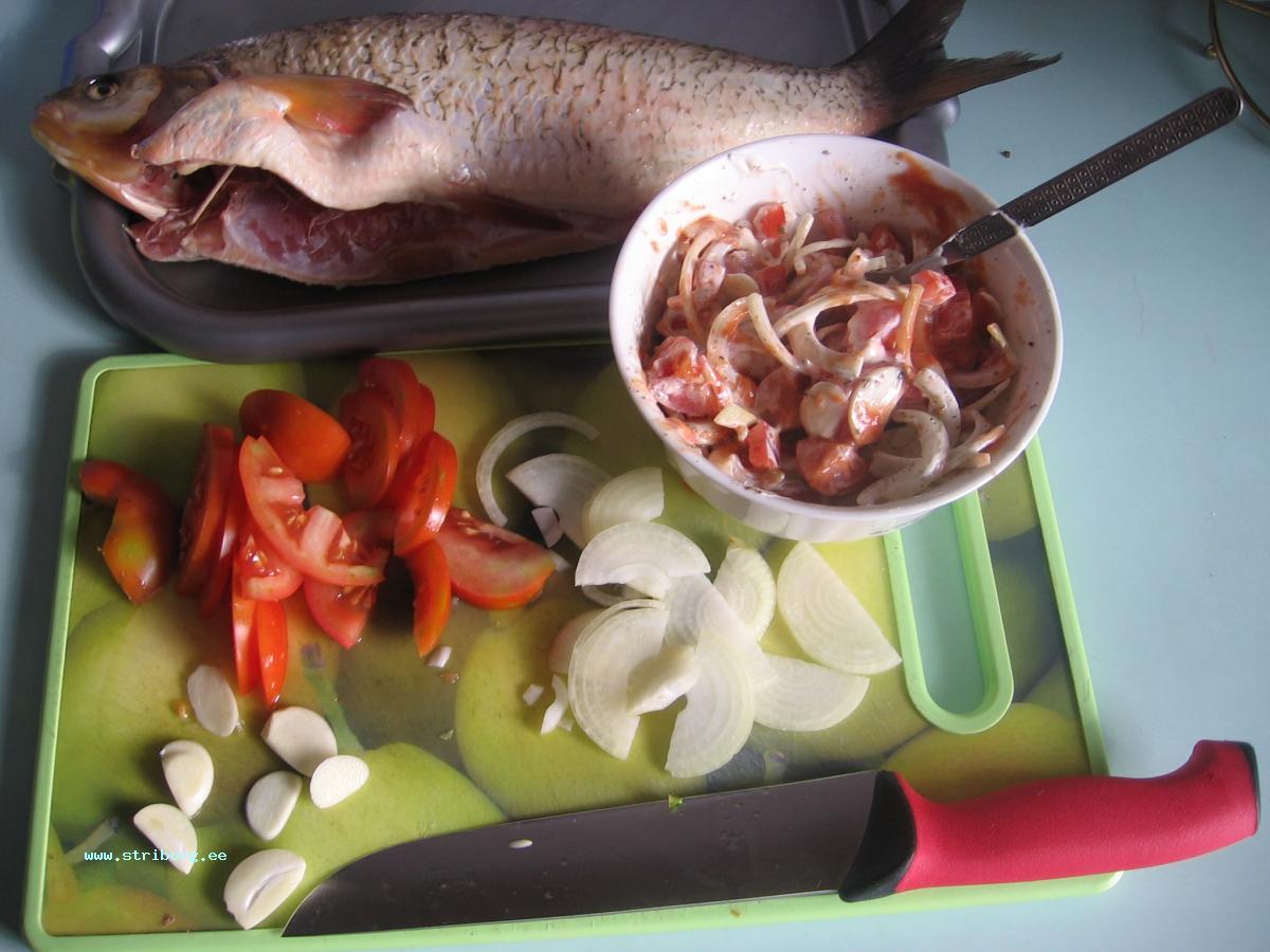 сергей писал(а):Делаем поперечные надрезы(с обеих сторон) и тоже начиняем их чесноком,луком,помидорками