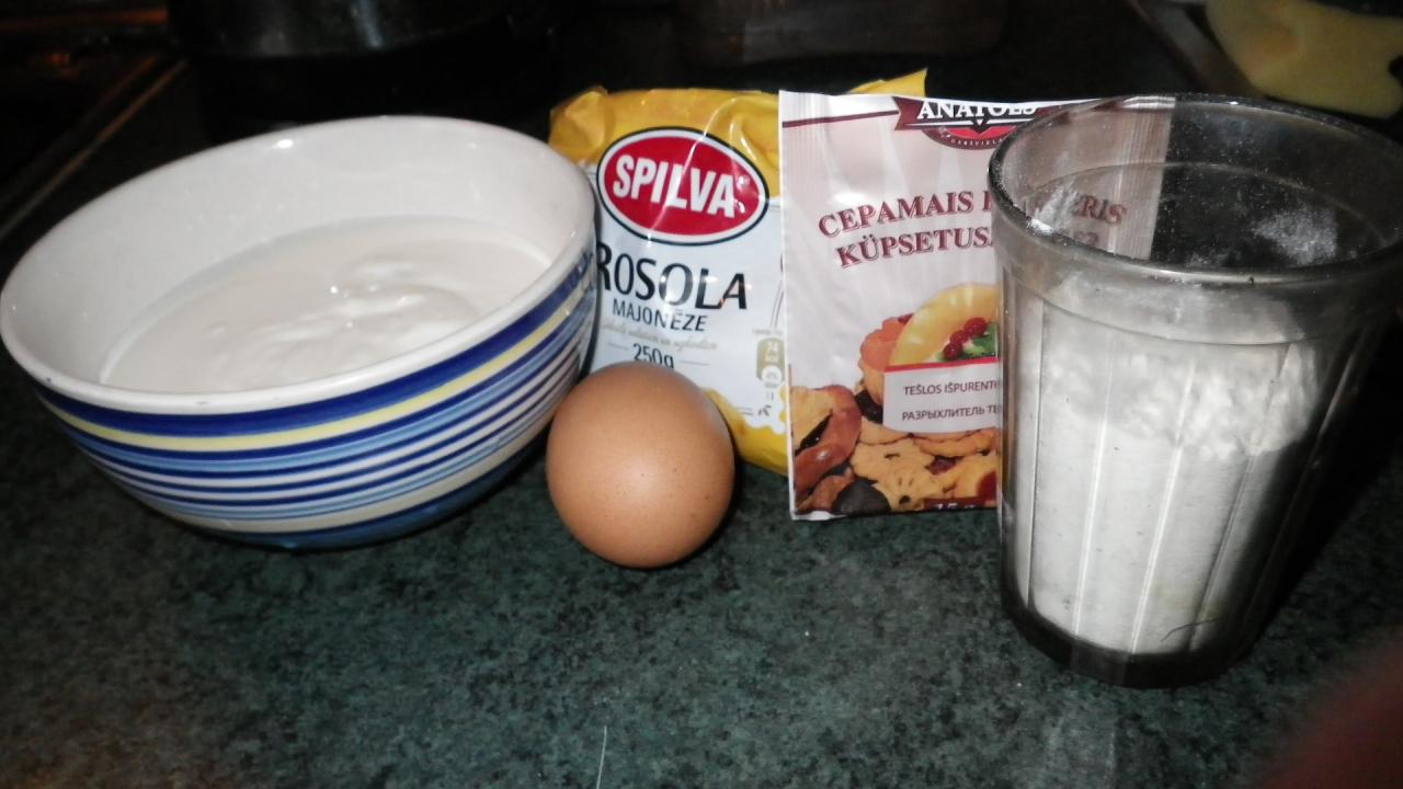 Для теста берём пачку майонеза,пачку сметаны, одно яйцо, 0,5 пакетика разрыхлителя для теста и муки примерно две столовые ложки с горкой.